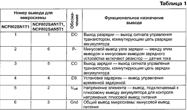 Если к обозначению добавлен индекс G, микросхема экологически безопасна (не содержит свинца). На корпус микросхем NCP802 нанесена лишь условная маркировка - буквы KN и код даты изготовления. Полное наименование со всеми индексами указано только в сопроводительной документации. Цоколевка микросхем представлена в табл. 1.