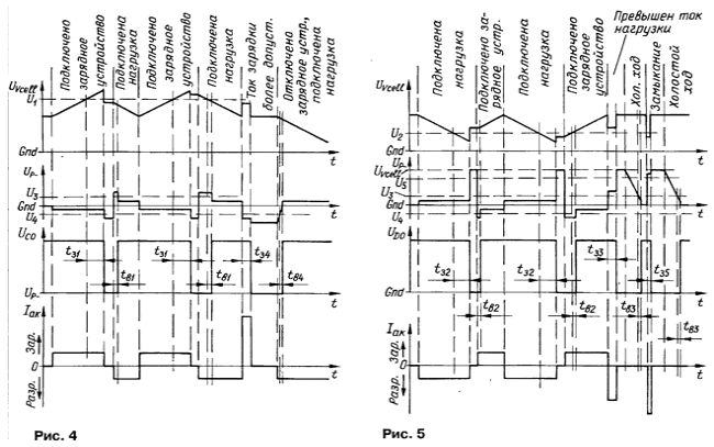Временные диаграммы напряжения на различных выводах микросхемы и тока в цепи аккумулятора G1 показаны на рис. 4 и 5. Первый из них иллюстрирует работу узла защиты аккумулятора от перезарядки и превышения допустимого зарядного тока, а второй - от чрезмерной разрядки и превышения допустимого разрядного тока.