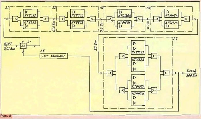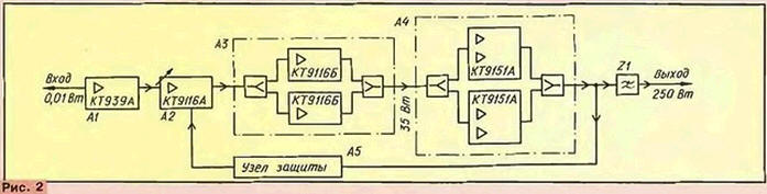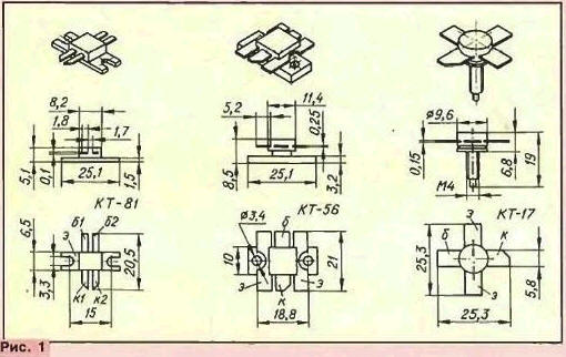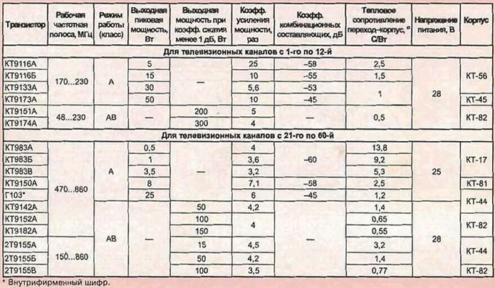 ЭНЦИКЛОПЕДИЯ РАДИОЭЛЕКТРОНИКИ И ЭЛЕКТРОТЕХНИКИ Линейные СВЧ транзисторы для усилителей мощности. Справочные данные Энциклопедия радиоэлектроники и электротехники / Справочные материалы Современный уровень развития РЭА и ее элементной базы позволяет в настоящее время создавать полностью твердотельные УКВ ЧМ и телевизионные передатчики с выходной мощностью до 5 кВт [1,2]. Усилительные тракты на основе широкополосных транзисторных усилителей имеют ряд преимуществ по сравнению с ламповыми. Твердотельные передатчики более надежны, электробезопасны, удобны в эксплуатации и легче в производстве. При блочно-модульной конструкции передатчика отказ одного из блоков оконечного усилителя не приводит к срыву эфирного вещания, поскольку передача будет продолжаться до замены блока, только с пониженной мощностью. Кроме того, широкополосный тракт транзисторного усилителя не требует дополнительной настройки на конкретный канал в пределах рабочей полосы частот[3]. Принято считать, что надежность передатчика зависит, прежде всего, от надежности применяемых активных компонентов. Благодаря применению современных мощных линейных СВЧ транзисторов, конструктивные особенности и технология изготовления которых обеспечивают существенное увеличение их времени наработки на отказ, вопрос повышения надежности твердотельных передатчиков получил принципиальное решение [4]. Растущие требования к техникоэкономическим показателям УКВ ЧМ и телевизионных мощных передатчиков, а также достигнутый уровень отечественной технологии в области создания мощных кремниевых биполярных транзисторов стимулировали развитие нового класса приборов - мощных линейных СВЧ транзисторов. НИИ электронной техники (г. Воронеж) разработал и выпускает их широкую номенклатуру для применения в метровом и дециметровом диапазонах волн. Транзисторы специально рассчитаны на использование в мощных телевизионных и радиовещательных передатчиках, ретрансляторах, в частности, в телевизионных ретрансляторах с совместным усилением сигналов звука и изображения, а также в усилителях многоканального сигнала базовых станций сотовой системы связи [5]. Эти транзисторы отвечают чрезвычайно жестким требованиям к линейности передаточной характеристики, имеют запас по рассеиваемой мощности и, как следствие, повышенную надежность. Конструктивно такие транзисторы выполнены в металло-керамических корпусах. Их внешний вид изображен на рис. 1 (показаны корпусы не всех упоминаемых в статье транзисторов; недостающие можно увидеть в статье [6]). Высокие линейные и частотные свойства транзисторных структур реализованы благодаря применению прецизионной изопланарной технологии. Диффузионные слои имеют субмикронную проектную норму. Ширина эмиттерных элементов топологии - около 1,5 мкм при чрезвычайно развитом их периметре. В целях устранения отказов, вызванных вторичным электрическим и тепловым пробоем, транзисторную структуру формируют на кремниевом кристалле с двуслойным эпитаксиальным коллектором и использованием эмиттерных стабилизирующих резисторов. Долговременной надежностью транзисторы обязаны также применению многослойной металлизации на основе золота. Линейные транзисторы с рассеиваемой мощностью более 50 Вт (за исключением КТ9116А, КТ9116Б, КТ9133А), как правило, им