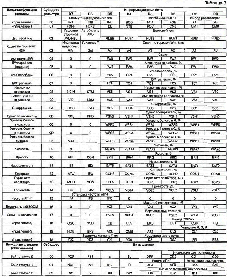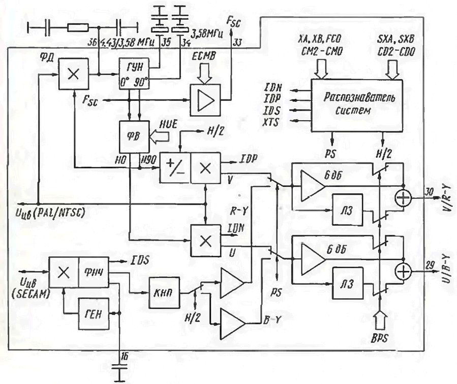 Кроме сигнала с выхода радиоканала, на коммутатор могут поступать дополнительные внешние видеосигналы (ПЦТВ или сигналы Y и С для режима S-VHS). Режим работы коммутатора выбирают по цифровой шине битами INA. INB, INC. При обработке сигнала с радиоканала и внешних источников бит INA равен 0. При этом распределение сигналов на выходах соответствует табл. 1. При комбинации INB=1, INC=0 включен режим S-VHS. В яркостный канал проходит сигнал Y с входа 11. а в цветовой канал на цветовые фильтры - цветовая компонента С с входа 10. На выводе 38 формируется ПЦТВ суммированием компонент S-VHS. В канале Y ПЦТВ. пройдя регулируемую линию задержки ЛЗЯ и режектор сигнала цветности, поступает на обостритель фронтов и подавитель шумов. Задержку регулируют ступенями по 40 не битами YDO-YD3. Для выделения сигналов цветности в цветовом канале использованы параллельно включенные гираторные полосовые фильтры - широкополосный для сигналов PAL/NTSC и узкополосный (КВП) для SECAM. Перед цветовыми фильтрами включено устройство АРУ с пределами регулировки от +6 до -20 дБ. Если телевизор работает от видеомагнитофона S-VHS, то режектор цветности выключен, а вместо него добавлена постоянная дополнительная задержка 160 не. Затем сигнал яркости проходит регулируемый по цифровой шине обостритель фронтов и подавитель шума м выходит через вывод 28. С входа регулируемой ЛЗ сигнал яркости внутри микросхемы приходит на строчный синхросе-лектор. С третьего выхода коммутатора выбранный ПЦТВ через вывод 38 микросхемы подают на внешний разделительный гребенчатый фильтр (например, на микросхему SAA4961). Выходные сигналы с этого фильтра, как показано на рис. 1, подводят к выводу 11 (для составляющей Y) и к выводу 10 (для составляющей цветности). В этом режиме бит INA равен 1. а режим коммутатора определяется табл. 2. Причем в гребенчатом фильтре может обрабатываться как внутренний, так и внешний ПЦТВ. Сигналы цветности с выходов полосовых фильтров поступают внутри микросхемы на цветовой декодер, детализированная структурная схема которого изображена на рис. 4. В нем использованы раздельные демодуляторы PAL/NTSC и SECAM. Образцовая цветовая поднесущая для демодуляторов PAL/NTSC вырабатывается системой ФАПЧ, которая включается на время прохождения цветовых вспышек. Она содержит ГУН. частота которого задается одним из двух внешних кварцевых резонаторов, подключенных к выводам 34 и 35 микросхемы, внешний фильтр нижних частот, подсоединенный к выводу 36. фазовый детектор ФД, сравнивающий фазу вспышки с фазой ортогональной компоненты выходного сигнала ГУН, а также фазовращатель (ФВ), через который регулируют цветовой тон в режиме NTSC (управляется по цифровой шине битами HUEO - HUE5). Сигнал ошибки, вырабатываемый фазовым детектором, пропорционален функции Sin(2пΔft). где Δf = fryн-fоcn.