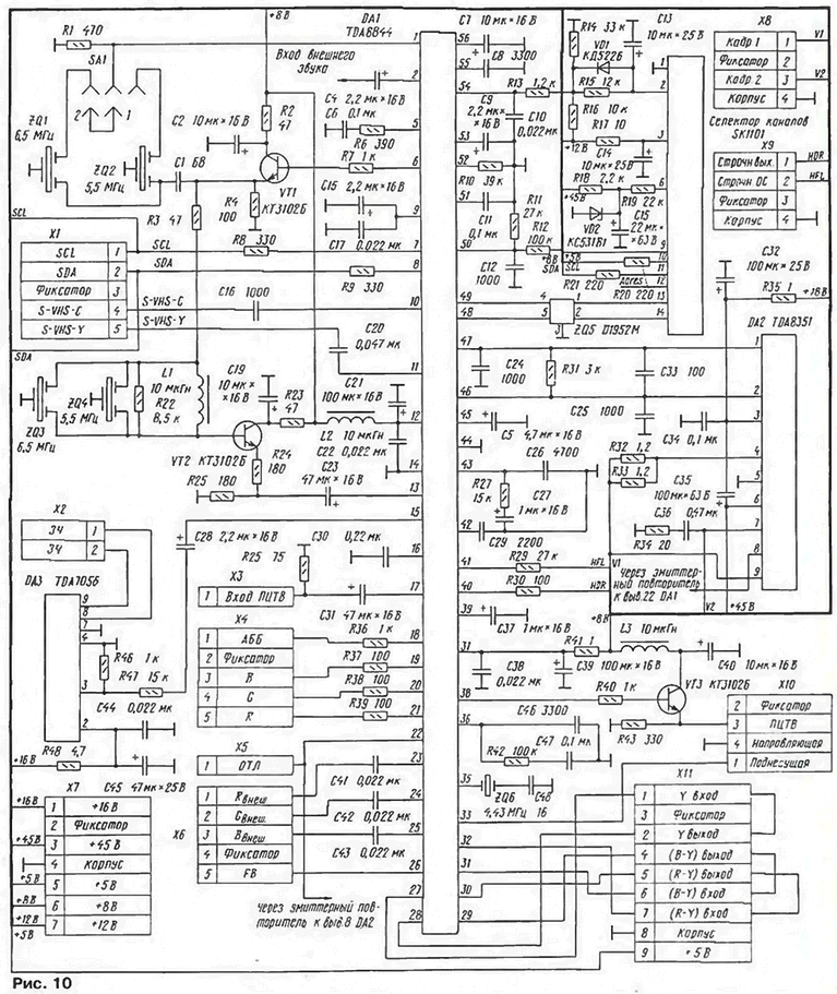 Чтобы заработала строчная развертка, должны быть загружены все биты субадресов. В регистры, которые не используют, загружают значение, равное 0. Упрощенная принципиальная схема включения видеопроцессора TDA8844 изображена на рис. 10. В устройстве использован селектор каналов с синтезом частоты SK1101 финской фирмы SALORA Фильтр ПАВ ZQ5 обеспечивает обработку сигналов стандартов D/K и B/G. Демодулированный ЛЦТВ с вывода 6 видеопроцессора DA1 поступает на эмиттерный повторитель на транзисторе VT1. Керамические полосовые фильтры звука ZQ1 и ZQ2 подключают в соответствии с принимаемым телевизионным стандартом. Выделенный сигнал разностной звуковой частоты проходит на вывод 1 видеопроцессора. В цепи эмиттера транзистора VT1 включены также керамические режекторные фильтры звука ZQ3, ZQ4. Через эмиттерный повторитель на транзисторе VT2 режектированный видеосигнал приходит на вывод 13 микросхемы DA1. Модуль рассчитан на обработку сигналов систем SECAM, PAL и NTSC-4.43. Поэтому использован только один кварцевый резонатор ZQ6 на 4,43 МГц, подключенный к выводу 35. Демодулированный сигнал звука с вывода 15 поступает на вход монофонического усилителя 34 на микросхеме DA3. На вывод 2 микросхемы DA1 можно подать внешний звуковой сигнал. На вывод 17 видеопроцессора подают внешний ПЦТВ. На разъем XII выходят демодулированные сигналы Y U, V. Они могут подвергаться внешней обработке или через показанные на схеме перемычки возвращаться в микросхему. Демодулированный ПЦТВ выходит на разъем Х10, служащий для подключения гребенчатого фильтра. На схеме показано подключение микросхемы DA2 выходного усилителя кадровой развертки. Для упрощения не изображено соединение вывода 8 этой микросхемы с выводом 22 видеопроцессора (защита от выключения кадровой развертки), а также цепи ограничения токов лучей кинескопа. Выходные кадровые сигналы выходят на разъем Х8. Для управления видеопроцессором TDA8844 фирма Philips выпускает процессор SAA5296 с версией программы CTV832S (или R с русскоязычным меню). Автор: Б.Хохлов, г.Москва