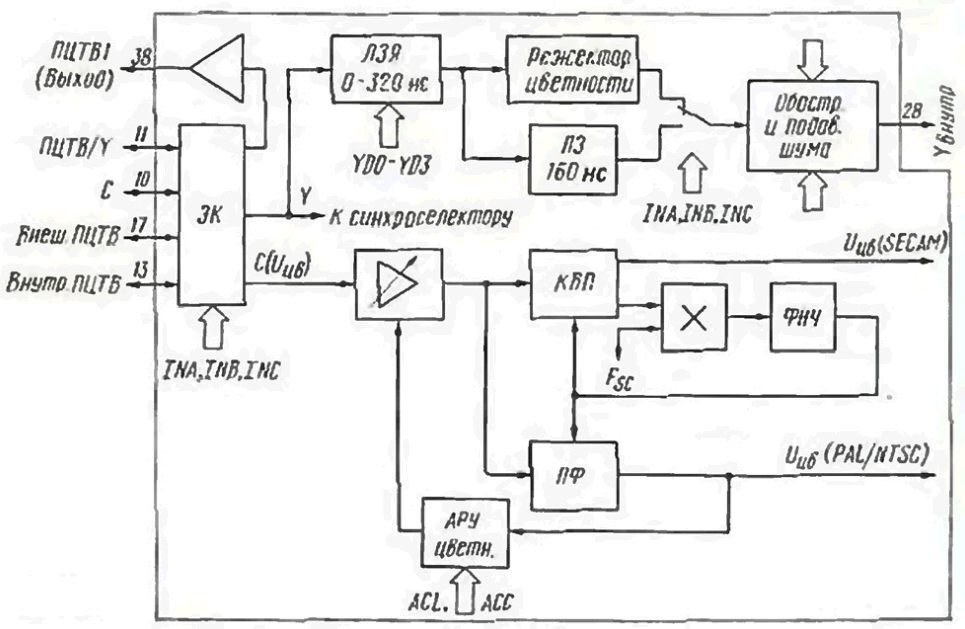 После усиления сигнал демодулируется синхронным детектором, в котором образцовый сигнал с удвоенной частотой вырабатывается в системе ФАПЧ без использования внешнего контура. Исходную частоту ГУН регулируют внутри микросхемы по цифровой шине (биты IFA, IFB. IFC). При этом для калибровки используют один из кварцевых резонаторов цветового декодера. Полоса захвата системы ФАПЧ равна ±1 МГц. Постоянную времени полосового фильтра ФАПЧ изменяют битом FFI. При демодуляции сигнал умножается на образцовый. УПЧИ охвачен петлей системы АРУ ключевого типа. Специальный узел с регулируемой задержкой формирует напряжение АРУ для селектора каналов. Значение задержки определяется битами ТОР0 - ТОР5, что соответствует входному сигналу 0,4...80 мВ. Напряжение АРУ снимается с транзистора с открытым коллектором и выводится через вывод 54. Микросхема позволяет обрабатывать радиосигналы как с негативной, так и с позитивной модуляцией (переключение происходит по цифровой шине битом MOD. подаваемым на демодулятор и детектор АРУ). При позитивной модуляции ключевыми импульсами системы АРУ служат вырабатываемые в процессоре в интервалах гашения по полям импульсы, амплитуда которых соответствует уровню белого 100 %. Эти импульсы применены также в устройстве автобаланса в белом. Сигналы АПЧГ и опознавания станции (СОС) преобразуются в цифровые слова (AFA, AFB - для АПЧГ и IFI - для СОС) и передаются в процессор управления по цифровой шине. Демодулированный полный цветовой видеосигнал (ПЦТВ) через разделительный буферный каскад выходит через вывод 6 микросхемы. Внешний полосовой фильтр ПФ (см. рис. 1) выделяет сигнал разностной частоты, который через вывод 1 направляется в канал звука. ПЦТВ, в котором звуковой сигнал подавлен внешним режекторным фильтром РЕЖ, через вывод 13 микросхемы проходит на внутренний коммутатор видеосигналов. Более подробная структура коммутатора, имеющего три выхода, показана на рис. 3.