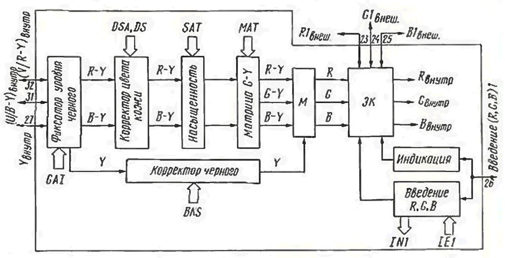 В микросхеме применена переключаемая по цифровой шине матрица М. имеющая два режима работы: стандартное матрицирование PAL (EBU) и матрицирование, соответствующее характеристикам японских кинескопов. Управление обеспечивается битом МАТ. После матрицы включен быстрый электронный коммутатор, позволяющий вводить вместо внутренних внешние текстовые сигналы (R, G, В)1 (например, сигналы телетекста). Управляется коммутатор через вывод 26 и по шине IX. Если постоянное напряжение на выводе меньше 3 В. а бит IE1 равен 0. используются внутренние сигналы R. G, В. Если бит IE1 равен 1. на выход проходят внешние сигналы R, G. В. Наконец, при IE1, равном 1, и напряжении на выводе 26, большем 4 В. на кинескоп поступают сигналы индикации с процессора управления. Эти сигналы приходят на выводы 19-21. После коммутатора сигналы R. G. В проходят (рис. 6) регуляторы контрастности и яркости, управляемые по цифровой шине, а также каскад коррекции по синему цвету. Последний включается битом BLS. Он уменьшает амплитуды составляющих R и G на 14 %, когда размах сигналов превышает 80 %. При этом повышается яркость белых участков изображения. Бит EBS дополнительно увеличивает коррекцию по синему цвету (сигнал R уменьшается на 20 %, а сигнал G - на 8 %).