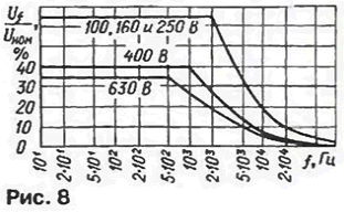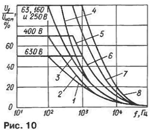 Ассортимент выпускаемых конденсаторов К78-12 представлен в табл. 4. На рис. 8 показана зависимость допускаемой амплитуды переменного или синусоидальной составляющей пульсирующего напряжения Uf0 (в относительных единицах; по вертикальной оси отложены в процентах значения отношения текущего напряжения Uf к номинальному UHOM). К78-16 Малогабаритные высокочастотные фольговые конденсаторы К78-16 предназначены для работы в цепях постоянного, переменного, пульсирующего и импульсного тока. По конструкции - окукленные пластиком (см. рис. 1); выводы - проволочные, жесткие, луженые, диаметром 0,5 ±0,1 мм.