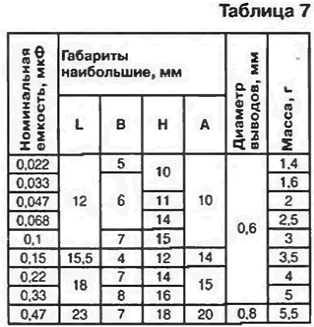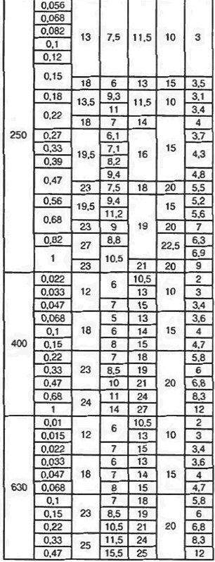 Ассортимент выпускаемых конденсаторов К73-14М представлен в табл. 3. Если конденсаторы работают при температуре более 70"С, напряжение на них необходимо снижать в соответствии с графиком на рис. 5. Зависимость допускаемой амплитуды синусоидального (или синусоидальной составляющей пульсирующего) напряжения Ut от частоты f показана на рис. 6. К73-15М Фольговые конденсаторы К73-15М предназначены для работы в цепях постоянного, переменного и пульсирующего тока. Изолированы липкой лентой; торцы залиты эпоксидным компаундом. Выводы - проволочные жесткие луженые длиной 25...30 мм; в остальном внешний вид соответствует рис. 1. Диаметр выводов - от 0.6 до 1 мм в зависимости от габаритов и массы конденсаторов. Климатическое исполнение - УХЛ (см. К73-11).