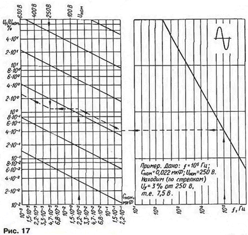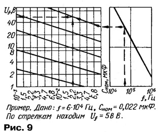 Рабочее напряжение при температуре 125°С равно половине номинального. Ассортимент выпускаемых конденсаторов К73-17 представлен в табл. 5. В табл. 6 сведены значения предельно допускаемых амплитуды импульсного тока и скорости изменения напряжения. Зависимость относительного допускаемого напряжения UT от температуры окружающей среды изображена на рис. 2. Зависимость относительной допускаемой амплитуды синусоидального (или синусоидальной составляющей пульсирующего) напряжения Uf от частоты f показана на рис. 10. Отрезки кривых на этом графике соответствуют следующим значениям емкости конденсаторов на указанное номинальное напряжение: 1 - 0,068-0,47 мкФ; 2 - 0,15-1 мкФ; 3 - 0,33-2,2 мкФ; 4 - 1,6-4,7 мкФ; 5 - 0.22-0,1 мкФ; 6 - 0,01-0.047 мкФ; 7 - 0,047-0.22 мкФ; 8 - 0.18-1 мкФ. К73-17М Миниатюрные металлопленочные конденсаторы К73-17М предназначены для работы в цепях постоянного, переменного, пульсирующего и импульсного тока. Изолированы методом окукливания пластмассой. Выводы - проволочные жесткие луженые длиной 16...20 мм; в остальном по внешнему виду не отличаются от К73-17 (рис. 9). Климатическое исполнение - УХЛ (см. К73-11).