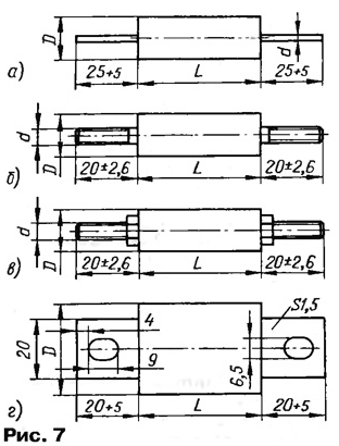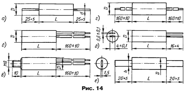 В табл. 7 сведены значения предельно допускаемых амплитуды импульсного тока и скорости изменения напряжения. К78-29 Металлопленочные конденсаторы К78-29 предназначены для работы в цепях переменного тока частотой 50 и 60 Гц в качестве встроенных элементов внутри комплексных изделий, в том числе в узлах привода трехфазных асинхронных электродвигателей при питании от однофазных сетей, в пусковых устройствах люминесцентных и других газоразрядных ламп. Обернуты липкой лентой, торцы залиты эпоксидным компаундом; по конструкции выводов предусмотрено шесть вариантов (рис. 14): а - проволочные, жесткие, луженые, разнонаправленные; б-г - гибкие, изолированные, луженые, бив - однонаправленные, г - разнонаправленные, вариант в снабжен крепежным резьбовым хвостовиком; д и е выводы - жесткие пластинчатые, луженые, д - однонаправленные, е - разнонаправленные. Варианты вид рассчитаны на диаметр корпуса 25 мм и более. Сечение гибких выводов конденсаторов вариантов б-г на номинальное напряжение 250 Вэфф 0,5 мм2 для номинальной емкости 20 мкФ и менее и 0,75 мм2 - более 20 мкФ, а на номинальное напряжение 450 Вэфф 0,5 мм2 - 12 мкФ и менее и 0,75 мм2 - более 12 мкФ.