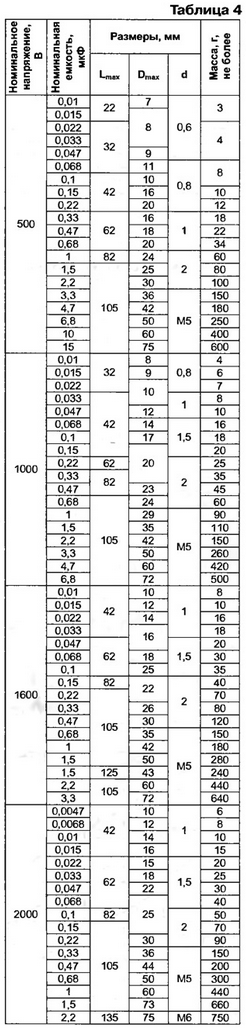 Ассортимент выпускаемых конденсаторов К73-41 представлен четырьмя номиналами: 0,01 мкФ с габаритами LxВxН 8,5x5x7,1 мм и массой 0,5 г; 0.022 мкФ. 8,5x5,6x9 мм, 0.5 г; 0.027 мкФ. 8,5x6,3x9 мм, 1 г и 0.033 мкФ. 8,5x7,1x10 мм, 1 г. Зависимость допускаемой относительной амплитуды синусоидального (или синусоидальной составляющей пульсирующего) напряжения Uf от частоты f показана на рис. 19. Ассортимент выпускаемых конденсаторов К78-106 представлен в табл. 3. В ней знаком * отмечены конденсаторы, имеющие относительно меньшие габариты, в силу чего для обеспечения той же надежности на них следует подавать меньшее напряжение. Этот факт отражен также и на графике-номограмме, показанной на рис. 6. Номограмма позволяет определить, какова максимальная амплитуда переменного синусоидального (или переменной составляющей пульсирующего) напряжения Uf, которое можно прикладывать к конденсатору при том или ином значении частоты f. К78-12 Высокочастотные пленочные конденсаторы К78-12 предназначены для работы в цепях постоянного, переменного, пульсирующего и импульсного тока. Конденсаторы обернуты липкой лентой, торцы залиты эпоксидным компаундом. По конструкции выводы делятся на четыре варианта (рис. 7): а - проволочные жесткие, луженые; б - в виде резьбовых шпилек; в - в виде резьбовых шпилек с гайками у корпуса (для конденсаторов емкостью 2,2 мкФ на номинальное напряжение 2000 В); г - в виде плоских жестких пластин (для конденсаторов диаметром D=36 мм и более).
