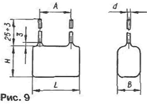 По требованию заказчика могут быть изготовлены конденсаторы с другой номинальной емкостью. К73-24в Металлопленочные конденсаторы К73-24В предназначены для работы в цепях постоянного, переменного, пульсирующего и импульсного тока. Изолированы методом окукливания пластмассой. Выводы - проволочные жесткие луженые длиной 20...25 мм; в остальном по внешнему виду не отличаются от К73-17 (рис. 9). Диаметр выводов - от 0.6 до 0.8 мм в зависимости от габаритов и массы конденсатора. Климатическое исполнение - УХЛ (см. К73-11). Можно применять взамен конденсаторов К73-17. К73-30. К73-34. К73-5.