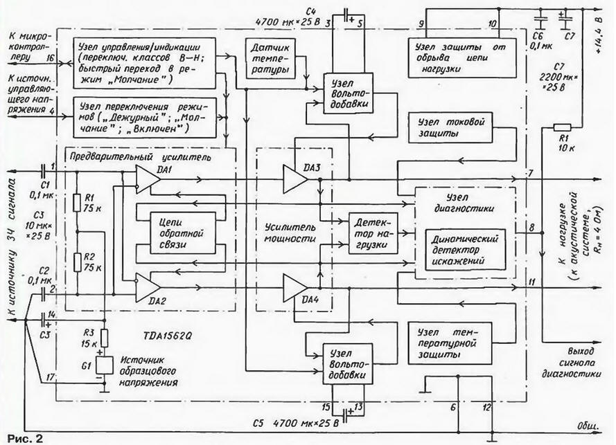 ЭНЦИКЛОПЕДИЯ РАДИОЭЛЕКТРОНИКИ И ЭЛЕКТРОТЕХНИКИ Усилитель мощности ЗЧ со средствами диагностики TDA1562Q. Справочные данные Энциклопедия радиоэлектроники и электротехники / Справочные материалы Описываемая микросхема представляет собой мостовой монофонический усилитель сигнала 3Ч с максимальной выходной мощностью до 70 Вт на нагрузке сопротивлением 4 Ом и предназначена для применения в автомобильной и бытовой звуковоспроизводящей аппаратуре. Конструктивно усилитель оформлен в пластмассовом корпусе DBS17P с 17-ю жесткими лужеными выводами (рис. 1). Тыльная плоская сторона корпуса выполнена d виде металлической теплоотводящей пластины. Этой стороной микросхему крепят к массивной металлической стенке аппарата, предварительно покрыв поверхность стыка теплопроводной пастой. Масса прибора - не более 10 г. При минимуме необходимых внешних компонентов микросхема обеспечивает возможность построения усилителя с большой выходной мощностью, питаемого от однополярного источника. Включенный под рабочее напряжение питания усилитель может находиться в одном из трех режимов - "Включен" ("On"), "Молчание" ("Mute") и "Дежурный режим" ("Standby"). В рабочем режиме "Включен" микросхема усиливает входной сигнал и выделяет в нагрузку установленную мощность, потребляя при этом соответствующий ток (до десятка ампер). В режиме "Молчание" входной сигнал на выход усилителя не проходит, но его мощные выходные ступени остаются включенными. По этой причине усилитель потребляет значительный ток, зато способен переключаться в режим "Включен" практически мгновенно. В "Дежурном режиме" оказываются обесточенными почти все узлы усилителя, и он потребляет от источника питания ничтожно малый ток - как правило, несколько микроампер. Время переключения из "Дежурного режима" в режим "Включен" не превышает 50 мс. Переключение из одного режима в другой реализуют подачей управляющего напряжения на вход выбора режима микросхемы. Усилитель обладает весьма низким уровнем собственных шумов и малым коэффициентом гармоник. Упрощенная функциональная схема усилителя и типовая схема его включения представлены на рис. 2. Если выходная мощность не превышает 18 Вт, усилитель работает в режиме класса В. При дальнейшем увеличении уровня входного сигнала внутреннее напряжение питания усилителя увеличивается благодаря включению узлов вольтодобавки с внешними оксидными конденсаторами большой емкости, подключаемыми к выводам 3,5 и 13. 15 микросхемы, как показано на функциональной схеме. Усилитель переходит в режим класса Н, а выходная мощность повышается до 70 Вт. Если кристалл микросхемы нагревается до температуры 120°С, встроенный датчик температуры переключает усилитель в режим класса В. Выходная мощность при этом не превышает 20 Вт. Если напряжение питания U микросхемы уменьшится до 7 В. усилитель автоматически переключится в режим "Молчание". При последующем увеличении напряжения питания до 9 В происходит возврат усилителя в режим "Включен". Микросхема снабжена также встроенными узлами защиты от взаимного замыкания выходных проводников и их замыкания на плюсовой провод питания и общий провод. Цоколевка микросхемы: выв. 1 - неинвертирующий вход сигнала 3Ч; выв. 2 - инвертирующий вход сигнала 3Ч; выв. 3 и 5 - выводы для подключения конденсатора волыодобавки верхнего по схеме плеча усилителя; вы