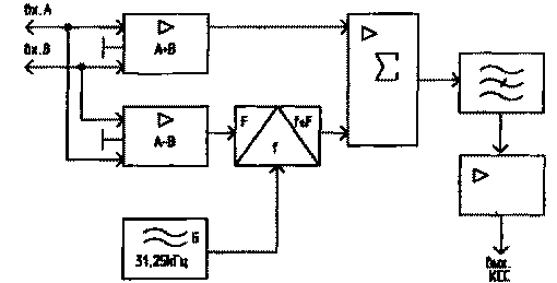 Сигналы от двух источников А и В (рис.2) суммируются и вычитаются в соответствующих блоках. Суммарный (А+В) сигнал проходит непосредственно на сумматор, а разностный (А-В) - модулирует по амплитуде частоту поднесущей (31,25 кГц), вырабатываемую генератором G. Далее-суммарный (А+В) сигнал и амплитудно модулированная разностным сигналом (А-В) частота поднесущей складываются и подаются на режекторный фильтр, который в 5 раз (-14 дБ) подавляет уровень поднесущей частоты. После фильтра комплексный стереосигнал (КСС) подается на модулятор УКВ передатчика.