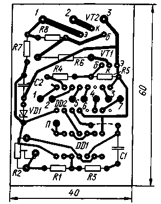 ЭНЦИКЛОПЕДИЯ РАДИОЭЛЕКТРОНИКИ И ЭЛЕКТРОТЕХНИКИ Цифровой узел управления стеклоочистителем. Энциклопедия радиоэлектроники и электротехники Энциклопедия радиоэлектроники и электротехники / Автомобиль. Электронные устройства Несложный электронный узел, которым я предлагаю дополнить машины ульяновского автозавода, расширит возможности управления стеклоочистителем. Несмотря на то, что устройство было разработано для автомобилей семейства УАЗ, оно может быть использовано и на "Жигулях" взамен отказавшего встроенного электромеханического регулятора. Схема узла показана на рис. 1. На логических элементах DD1.1, DD1.2 выполнен низкочастотный генератор прямоугольных импульсов, которые поступают на вход счетчика DD2. На транзисторах VT1, VT2 собран усилитель тока. Транзисторы работают в переключательном режиме. При появлении на выходе 0 счетчика высокого уровня открывается транзистор VT1 и вслед за ним VT2 - включается электродвигатель стеклоочистителя. Через некоторое время высокий уровень на выходе 0 счетчика сменяется низким, транзисторы закрываются и электродвигатель отключается, а счетчик продолжает счет. Как только высокий уровень появится на выходе 1 счетчика, этот уровень после двойного инвертирования элементами DD1.3, DD1.4 обнулит счетчик и начнется новый цикл счета импульсов. Если переключатель SA1 перевести в положение с большим номером, момент обнуления счетчика будет наступать позже, т. е. паузы между очередными включениями стеклоочистителя увеличатся. В положении "1" пауза практически отсутствует. Подстроечным резистором R2 устанавливают требуемую частоту генератора, а значит, и время работы электродвигателя стеклоочистителя в каждом цикле. На резисторе R7 и стабилитроне VD1 собран параметрический стабилизатор для питания микросхем. Все элементы узла, кроме транзистора VT2 и переключателя SA1, монтируют на печатной плате из фольгированного стеклотекстолита толщиной 1,5 мм. Чертеж платы представлен на рис. 2. Контактные площадки 1 - 7 и П, размещенные на плате со стороны печатных проводников вблизи места установки микросхемы DD2, предназначены для соединения с переключателем SA1. Его монтируют вблизи переключателя стеклоочистителя. Если не требуется такого широкого выбора длительности паузы, можно использовать переключатель SA1 на меньшее число положений. Для одного выбранного значения длительности паузы переключатель вообще не нужен; следует только площадку П соединить перемычкой с соответствующим выходом счетчика. Пусть, например, выбран выход 7 - тогда в каждом цикле щетки будут делать три двойных хода по стеклу, а пауза будет равна 5...7 с. Транзистор VT2 необходимо привинтить к небольшому теплоотводу в виде пластины размерами 60х40х3 мм из дюралюминия. Теплоотвод на четырех стойках крепят параллельно плате. Все резисторы узла, кроме R2 и R6, - МЛТ-0,125. Резистор R6 должен иметь мощность рассеяния не менее 2 Вт. Подстроечный резистор R2 - любого типа, лучше закрытой конструкции и с фиксацией вала. Конденсаторы - КЛС или КМ. Стабилитрон VD2 может быть любым на напряжение 8...10 В, желательно миниатюрным. Вместо транзистора КТ815Б подойдет любой из серий КТ815, КТ817, а вместо КТ818Б-любой из серии КТ818. Смонтированную плату помещают в коробку от реле МКУ-48 и закрепляют под приборной панелью автомобиля. О подключении узла к системе электрооборудовани