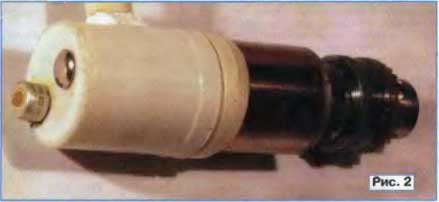 Включают сверлилку, касаясь пальцем держащей ее руки одного (Е2) или одновременно двух (Е1 и Е2) сенсорных контактов. Если убрать палец с контактов, питание двигателя М1 будет выключено, а его выводы соединены между собой, что обеспечит эффективное динамическое торможение. При касании пальцем сенсора Е2 сигналом управления двигателем служат наводки на тело работающего сетевого напряжения частотой 50 Гц. Этот сигнал, усиленный по току транзисторами VT1 и VT2, открывает транзистор VT4. Вместе с ним открывается и транзистор VT3, a VT5 закрывается. На двигатель поступают импульсы частотой 50 Гц, коэффициент заполнения которых увеличивается в зависимости от степени прижатия пальца к сенсору и может достичь 50 %. Этим достигается плавный пуск двигателя. Для подстройки чувствительности сенсора Е2 предусмотрен подстроечный резистор R2. При касании пальцем двух сенсоров одновременно транзисторы VT1-VT4 будут постоянно открыты, а транзистор VT5 закрыт. На двигатель поступит полное (за вычетом падения на транзисторе VT4) напряжение источника питания. Электродвигатель будет работать на максимальных оборотах. При отпускании сенсоров состояние всех транзисторов изменяется на противоположное. Открытый транзистор VT5 зашунтирует двигатель, обеспечивая его торможение. Сквозной ток через транзисторы VT4 и VT5 в моменты переключения отсутствует благодаря тому, что транзистор VT3 открывается, a VT5 закрывается при меньшем напряжении на эмиттере транзистора VT2, чем необходимо (с учетом диода VD1) для открывания транзистора VT4. Диод VD1 нужен и для исключения проникновения ЭДС обесточенного, но вращающегося по инерции электродвигателя на другие элементы регулятора. Внешний вид изготовленной сверлилки показан на рис. 2. В ней применен коллекторный электродвигатель постоянного тока ДПР-62 с номинальным напряжением питания 27 В. Можно использовать и другой подходящий по напряжению питания, мощности и габаритам двигатель постоянного тока. При его выборе следует обратить внимание на максимальный потребляемый ток при заторможенном роторе. Он не должен превышать допустимого для транзистора КТ829В тока коллектора (8 А). У двигателя ДПР-62 этот ток - около 2,5 А при напряжении питания 20 В. Металлический корпус установленного снаружи сверлилки подстроечного резистора R2 (СП5-16), соединенный через резистор R1 с плюсом источника питания, служит сенсором Е1. Сенсор Е2 - головка заклепки. Узел управления смонтирован на алюминиевой пластине толщиной 4 мм, как показано на рис. 3. Прежде всего к пластине крепят транзисторы VT4 и VT5, причем последний - через изолирующую прокладку. Остальные элементы припаивают к выводам этих транзисторов. Транзисторы КТ829В могут быть заменены на КТ829 с другими буквенными индексами. Транзисторы КТ315Г должны иметь как можно меньший обратный ток коллектора, вместо них можно применить КТ315А или КТ315В. Диод - любой из серий КД521, КД522. Собранный узел приклеивают к торцу двигателя двусторонней липкой лентой, обеспечивая этим и электрическую изоляцию между корпусом двигателя и основанием узла. Питать сверлилку следует от источника постоянного напряжения, имеющего хорошую гальваническую развязку от сети 220 В. При ее налаживании нужно подборкой резистора R5 для выполняемой работы добиться оптимальной эффективности торможения. Если время выбега ротора зависит от напряже