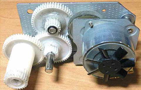 Во всех узлах устройства применены постоянные резисторы МЛТ, С2-33, оксидные конденсаторы К50-35 или импортные, остальные конденсаторы - К73-17. Микросхема DA2 блока сопряжения снабжена теплоотводом из отрезка алюминиевого уголка 20x25 мм с толщиной полок3 мм и длиной 55 мм. В полке уголка, не прилегающей к микросхеме, просверлено для улучшения циркуляции воздуха 12 отверстий диаметром 4 мм. Интегральные стабилизаторы DA1 и DA3 закреплены на таком же, но без дополнительных отверстий, теплоотводе. Привод шагового двигателя, изъятый из лазерного принтера XEROX PHASER 3121, переделан. Его основание обрезано до размеров 120x70 мм, оси некоторых шестерен аккуратно выпрессованы, в них просверлены отверстия диаметром 2,5 мм и глубиной 10 мм, в которых нарезана резьба М3 для крепления на основании в новых заранее рассчитанных точках. Чтобы уменьшить скорость вращения "печки", добавлены еще две шестерни. Получившийся привод показан на рис. 10. Его конструкция может быть и другой, все зависит от наличия деталей для доработки имеющегося привода.