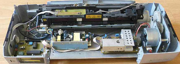 Для ламинатора использован корпус от струйного принтера HP photosmart 7260. Из его нижней половины удалены все ненужные перегородки и установлено основание размерами 300x130 мм из дюралюминиевого листа толщиной 3 мм. На основании закреплены "печка", извлеченная из лазерного принтера XEROX PHASER 3121, и ее привод с блоком сопряжения с двигателем, а также блок питания от ноутбука. С "печки" сняты все лишние детали: пластмассовый флажок, перекрывавший оптрон (датчик наличия бумаги), и некоторые другие. Плата датчиков закреплена винтом в верхней части "печки", причем датчики входят в имеющиеся там отверстия. В левой части корпуса находится плата узла управления. Расположена она так, чтобы установленными на ней кнопками можно было управлять с помощью старых предусмотренных в использованном корпусе клавиш. Собранный ламинатор без верхней откидывающейся крышки показан на рис. 11. На этой крышке закреплен вентилятор. Для забора наружного воздуха в ней сделано круглое отверстие.