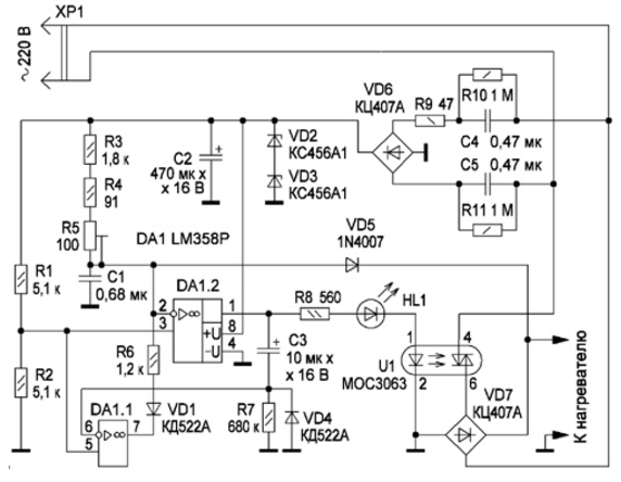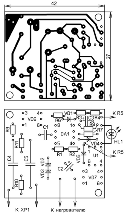 Рассмотрим работу регулятора. По известной схеме на выпрямительном мосте VD6, гасящих конденсаторах С4, С5, стабилитронах VD2, VD3 и сглаживающем конденсаторе С2 собран источник питания узла управления. Сам узел собран на двух ОУ, включенных компараторами. На неинвертирующий вход (вывод 3) ОУ DA1.2 подано образцовое напряжение с резистивного делителя R1R2. На его инвертирующий вход (вывод 2) подано напряжение с делителя, верхнее плечо которого состоит из резистивной цепи R3-R5, а нижнее - нагревателя, подключенного к входу ОУ через диод VD5. В момент включения питания сопротивление нагревателя понижено и напряжение на инвертирующем входе ОУ DA1.2 меньше напряжения на неинвертирующем. На выходе (вывод 1) DA1.2 будет максимальное положительное напряжение. Выход DA1.2 нагружен последовательной цепью, состоящей из ограничительного резистора R8, светодиода HL1 и встроенного в оптрон U1 излучающего диода. Светодиод HL1 сигнализирует о включении нагревателя, а излучающий диод оптрона открывает встроенный фотосимистор. Выпрямленное мостом VD7 напряжение сети 220 В поступает на нагреватель. Диод VD5 будет закрыт этим напряжением. Высокий уровень напряжения с выхода DA1.2 через конденсатор СЗ воздействует на инвертирующий вход (вывод 6) ОУ dA 1.1. На его выходе (вывод 7) возникает низкий уровень напряжения, которое через диод VD1 и резистор R6 уменьшит напряжение на инвертирующем входе ОУ DA1.2 ниже образцового. Это обеспечит поддержание высокого уровня напряжения на выходе этого ОУ Такое состояние остается стабильным в течение времени, которое задано дифференцирующей цепью C3R7. По мере зарядки конденсатора С3 напряжение на резисторе R7 цепи падает, и когда оно станет ниже образцового, на выходе ОУ DA1. 1 низкий уровень сигнала сменится высоким. Высокий уровень сигнала закроет диод VD1, и напряжение на инвертирующем входе DA1.2 станет выше образцового, что приведет к смене на выходе ОУ DA1.2 высокого уровня сигнала низким и отключению светодиода HL1 и оптрона U1. Закрывшийся фотосимистор отключит мост VD7 и нагреватель паяльника от сети, а открытый диод VD5 подключит его к инвертирующему входу ОУ DA1.2. Погасший светодиод HL1 сигнализирует об отключении нагревателя. На выходе DA1.2 низкий уровень напряжения будет держаться до тех пор, пока в результате остывания нагревателя паяльника его сопротивление не понизится до точки переключения DA1.2, заданной, как уже сказано выше, образцовым напряжением с делителя R1R2. Конденсатор С3 к тому времени успеет разрядиться через диод VD4. Далее, после переключения DA1.2, вновь включится оптрон U1 и весь процесс повторится. Время остывания нагревателя паяльника будет тем больше, чем выше температура всего паяльника и меньше расход тепла на процесс паяния. Конденсатор С1 уменьшает наводки и высокочастотные помехи из сети. Печатная плата размерами 42x37 мм изготовлена из односторонне фольгированного стеклотекстолита. Ее чертеж и расположение элементов приведены на рис. 3.