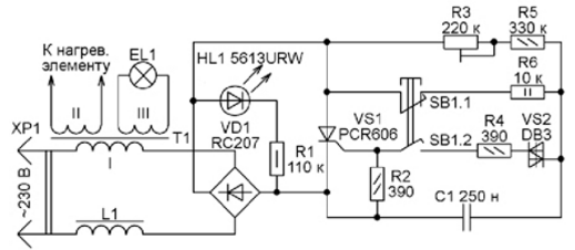 В этом режиме индикаторный светодиод HL1 светится, сигнализируя, что вилкаXP1 включена в розетку, в которой присутствует напряжение, а сетевой шнур, обмотка I трансформатора T1 и дроссель L1 не имеют обрывов. Светодиод должен быть красного цвета свечения и достаточно ярким, что поможет не забыть вынуть вилку XP1 из розетки по завершении работы. Контакты SB1.2 принадлежат уже имеющейся в паяльнике кнопке включения. Они перенесены из цепи первичной обмотки трансформатора в цепь управляющего электрода тринистора VS1. И вот почему. При размыкании контактов, находящихся в цепи обладающей большой индуктивностью первичной обмотки трансформатора, возникает импульс напряжения самоиндукции, который вызывает искрение контактов, что приводит к их преждевременному износу. В нашем случае этот импульс, амплитуда которого бывает гораздо больше номинального сетевого напряжения, был бы приложен и к диодам выпрямительного моста VD1, и к тринистору VS1, создавая опасность их пробоя. Дополнительные контакты SB1.1 (микровыключатель МП3) установлены на кнопке включения при доработке. Микровыключатель закреплен термоклеем так, чтобы при нажатии на кнопку сначала замкнулись ее контакты SB1.2 и лишь при дальнейшем нажатии разомкнулись контакты микропереключателя. При частичном нажатии на кнопку, вызвавшем лишь замыкание контактов SB1.2, регулятор мощности начинает работать. Поскольку через оставшиеся замкнутыми контакты SB1.1 резистор R6 шунтирует резисторы R3 и R5 фазосдвигающей цепи, три-нистор VS1 открывается в самом начале каждого полупериода сетевого напряжения и на первичную обмотку трансформатора поступает практически полное напряжение сети. Паяльник быстро разогревается. В этом режиме падение напряжения на тринисторе VS1 минимально, поэтому светодиод HL1 не светится, что сигнализирует об идущем разогреве паяльника. Когда нужная температура достигнута, следует нажать на кнопку до упора. Контакты SB1.1 разомкнутся, резистор R6 перестанет шунтировать резисторы R3 и R5, поэтому задержка открывания тринистора увеличится. Мощность нагревания паяльника уменьшится. При этом станут светить с неполной яркостью светодиод HL1 и контрольная лампа паяльника EL1. Трансформатор негромко гудит, так как на него поступает напряжение искаженной формы. Все это сигнализирует, что паяльник работает на пониженной мощности, зависящей от положения движка подстроечного резистора R3. Нажать на кнопку включения паяльника так, чтобы контакты SB1.2 разомкнулись, а контакты SB1.1 остались замкнутыми, не просто, нужна тренировка и внимательность. Но это облегчается тем, что во время разогрева паяльник просто держат в руке, не отвлекаясь на пайку. Во время пайки на кнопку нужно нажать до упора и удерживать ее в таком положении, что совсем несложно. Именно поэтому разогрев происходит при кнопке, нажатой до половины, а пайка - при нажатой до упора, а не наоборот. Управление паяльником с помощью одной кнопки позволяет при необходимости быстро повысить температуру жала, слегка отпустив кнопку. Когда необходимость в этом проходит, кнопку вновь нажимают до упора и температура понижается до заданной подстроечным резистором R3. Налаживать этот регулятор так же тщательно, как описано в моей статье "Усовершенствование прибора для выжигания" ("Радио", 2014, №9, с. 44, 45), нет необходимости. Единственно, сопротивле