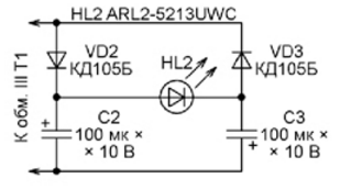 Дроссель L1 содержит пять слоев лакированного провода диаметром 0,6...0,7 мм, аккуратно намотанных виток к витку на ферритовом стержне диаметром 8...10 мм и длиной 2,5...3 см. Поместить его можно в ручке паяльника. Подробно описывать размещение регулятора в корпусе паяльника смысла нет. Оно зависит от особенностей конструкции паяльника и применяемых деталей. Пояснений требует только установка микровыключателя SB1.1 и светодиода HL1. Иногда конструкция паяльника такова, что не удается установить микровыключатель так, чтобы при нажатии на кнопку выключателя сначала замыкались ее контакты SB1.2, а лишь затем размыкались контакты микровыключателя SB 1.1. В этом случае для переключения режима работы регулятора придется использовать отдельную кнопку или выключатель, установив его в удобном для нажатия свободным (например, большим) пальцем месте. Для светодиода HL1 я не стал сверлить отверстие. Корпус моего паяльника сделан из желтой пластмассы, через которую прекрасно видно свечение этого светодиода. Если же корпус паяльника непрозрачен, просверлите отверстие для светодиода в таком месте, чтобы он был хорошо виден, но не слепил глаза, мешая работе. Несколько слов о лампе подсветки (EL1 на рис. 1). Она довольно часто перегорает, поэтому целесообразно заменить ее светодиодом белого свечения. Яркость подсветки получится даже большей, чем с лампой накаливания. Поэтому рекомендую, когда в вашем паяльнике лампа подсветки в очередной раз перегорит, заменить ее светодиодом. Сделать это очень просто. Оберните перегоревшую лампу бумагой и отломите плоскогубцами стеклянную колбу от цоколя. Внутреннюю боковую поверхность цоколя очистите от остатков стекла и клея, которым была приклеена колба. Работать необходимо очень осторожно, чтобы не порезаться осколками стекла, и желательно в защитных очках, чтобы не поранить осколками глаза. Припаяйте один вывод светодиода к центральному контакту, а второй - к боковой поверхности цоколя. Всю конструкцию можно залить каким-либо клеем для упрочнения, но делать это совсем не обязательно. Светодиод можно взять любого типа в прозрачном корпусе. Напряжение обмотки III трансформатора паяльника - всего 2...2,5 В. Этого недостаточно для непосредственного подключения к ней светодиода белого свечения. Поэтому для него собран по схеме, представленной на рис. 3, выпрямитель с удвоением напряжения.