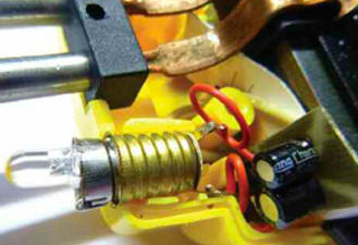 Ёмкость конденсаторов C2 и C3 подберите опытным путем, контролируя ток светодиода. Сначала установите конденсаторы емкостью по 20 мкФ. С ними ток через светодиод у меня получился около 20 мА. Если этого недостаточно, установите конденсаторы большей емкости. Подбирайте ток при включенном регуляторе, чтобы яркость подсветки получилась достаточной для пайки. Естественно, во время разогрева яркость будет больше, но усложнять устройство, добавляя стабилизатор тока, я считаю излишним, да и места для него просто не нашлось. Диоды КД105Б можно заменить любыми выпрямительными малогабаритными диодами с обратным напряжением не менее 20 В и допустимым выпрямленным током не менее 50 мА. Например, КД102А, КД103А или КД105 с другим буквенным индексом. Собран умножитель на плате из фольгированного стеклотекстолита размерами 30x12 мм. Чертеж ее не приведен ввиду его простоты. Если применить диоды КД102А или КД103А, то размеры платы умножителя могут быть еще меньше. Поместить ее можно в любом свободном месте корпуса. Например, как показано на рис. 4. При соединении платы с патроном учитывайте полярность изготовленной светодиодной лампы.