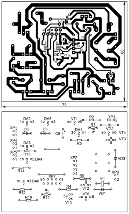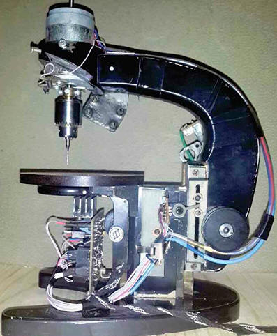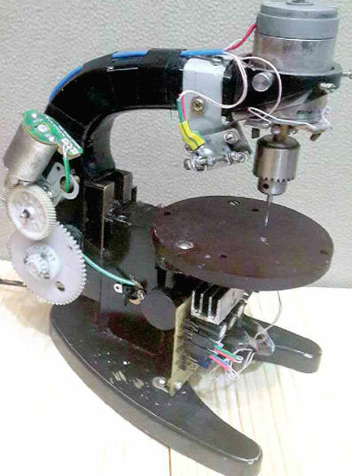 Постоянные резисторы R3, R7-R9, R15, керамические конденсаторы C1, C4, C5, C7 (все типоразмера 0805 для поверхностного монтажа) и микроконтроллер DD1 (в корпусе SOIC8) припаивают непосредственно к печатным проводникам. Остальные резисторы - МЛТ-0,25, конденсаторы - оксидные импортные. Транзисторы VT1, VT4, VT6 - любые серий КТ805, КТ819, VT3, VT5 - ВС337, ВС547, 2N2222, серий КТ315, КТ3102; VT2 - ВС337, 2N2222, любой из серий КТ630, КТ815, КТ972 (максимальное значение его коллекторного тока должно быть не меньше рабочего тока реле K1). В качестве ключа VT5VT6 можно применить один транзистор серии КТ829 или КТ972, а ключа VT3VT4 - один транзистор КТ827 или КТ829 с любым буквенным индексом. Реле K1 - R40-11D2-5/6, оно заменимо любым другим с напряжением срабатывания 5 В и с двумя группами переключающих контактов, рассчитанных на коммутацию тока не менее 1 А. Можно использовать реле на 12 В, подключив верхний (по схеме) вывод его обмотки (вместе с диодом VD1) к выходу (вывод 3) микросхемы DA2. Плата управления установлена под столиком и закреплена винтами М3 через уголки к основанию микроскопа (см. рис. 1). Микросхемы DA2 и DA5 установлены на теплоотводах. Желательно снабдить теплоотводом и транзистор VT1. Столик изготовлен из текстолита. Перед переделкой в сверлильный станок микроскоп необходимо разобрать, тщательно смыть довольно вязкую смазку, затрудняющую ход тубусодержателя (верхней части микроскопа), и смазать жидкой смазкой, например, трансформаторным маслом. Ход верхней части должен быть максимально легким, плавным и без люфта. От использования для крепления сверла классической цанги было решено отказаться. Применены конус Морзе и трехкулачковый патрон для сверл диаметром 0,3-4,5 мм. Соединение двигателя с патроном должно быть без биений. Юстировку точки лазера на обрабатываемой плате с помощью винтов производят в следующем порядке: сверлят отверстие в пластине фольгированного стеклотекстолита, аналогичного тому, из которого изготовлена плата, затем регулировочными винтами держателя юстируют точку лазера точно на отверстие. При этом надо постараться не смещать пластину. По моему опыту, если точка лазера пропала (перестала отражаться от фольги), то луч лазера попал в отверстие и отъюстирован. Толщина стеклотекстолита должна быть такой же, как и у изготовляемой платы. После этого можно быть уверенным в том, что лазер точно укажет центр будущего отверстия. При исправных деталях и безошибочном монтаже БУ в налаживании не нуждается. Станок эксплуатируется более года. Во время работы свободны обе руки, и поэтому работать на станке удобно. Я не сломал ни одного сверла, хотя изготовляю платы довольно часто, и я не представляю, как обходился без этого станка раньше. Теперь смело покупаю высококачественные дорогие сверла. На сверление 50 отверстий уходит не более получаса. Но все же необходима осторожность, есть опасность сломать хрупкое сверло при установке платы на рабочий столик станка - нечаянно стукнуть по сверлу. Вероятность поломки сверла при сверлении невелика, если, конечно, не двигать плату в это время. Программу микроконтроллера, а также негативный и позитивный фотошаблоны в формате .pdf для переноса рисунка печатных проводников на заготовку печатной платы можно скачать с ftp://ftp.radio.ru/pub/2015/07/stanok.zip. Литература
