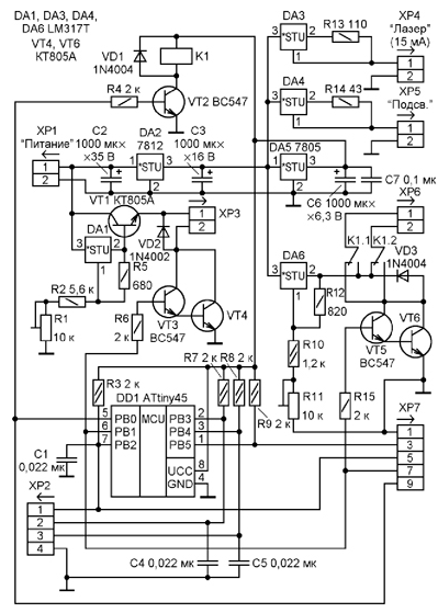 Скорость подачи регулируют подстроечным резистором R11. Электродвигатель использован маломощный (номинальное напряжение - 6 В, ток - 30 мА), но благодаря червячному редуктору он справляется со своей задачей вполне. Конструкция редуктора может быть любой, но должна обеспечивать достаточное усилие, чтобы легко поворачивать ручку микроскопа. Можно использовать шаговый электродвигатель. В первом проекте я так и сделал, но имевшийся шаговый двигатель обладал недостаточным моментом на валу, а подходящего найти не удалось. Если у кого-нибудь возник интерес по использованию шагового двигателя, можете обратиться ко мне через редакцию. Файлы проекта сохранились. В нем использовался микроконтроллер ATmega8. Ключ на составном транзисторе VT5VT6 включает и выключает электродвигатель подачи сверла (его подключают к вилке XP6), транзистор VT2 и реле K1 управляют ее направлением: вверх или вниз. Ключ на составном транзисторе VT3VT4 управляет электродвигателем привода сверла (его подсоединяют к вилке ХP3), на микросхеме DA1 и транзисторе VT1 собран стабилизатор частоты его вращения, регулируют частоту подстроечным резистором R1. Применять стабилизатор частоты вращения более сложный, например, как предложенный в [2], нет смысла, поскольку "прицеливаться" сверлом в центр отверстия "на глаз" не надо. Эксперименты по этому поводу проводились. На микросхеме DA6 собран стабилизатор напряжения питания электродвигателя подачи сверла [3]. Включенные последовательно интегральные стабилизаторы DA2 и DA5 предназначены для получения стабилизированных напряжений соответственно 12 и 5 В. Первое из них используется для питания стабилизаторов тока на микросхемах DA3, DA4, второе - для питания микроконтроллера и ключа на транзисторе VT2. Конденсаторы С2, C3, С6 - фильтрующие, остальные - блокировочные. На станке применена светодиодная подсветка. Ток подсветки и ток лазера стабилизированы: на микросхеме DA3 собран стабилизатор тока лазера, на DA4 - светодиодов подсветки. Ток стабилизации рассчитывают по формуле I = 1,25/R [3] и устанавливают подборкой резисторов R13 и R14. Благодаря стабилизированному току возможно подключение нескольких однотипных светодиодов подсветки последовательно. Лазер подключен к вилке ХP4, светодиоды - к ХP5. Разъем ХP7 предназначен для подключения программатора. Назначение его контактов соответствует программатору "TRITON+ V5.7T USB" [4]. Программа микроконтроллера разрабатывалась в интегрированной среде Code VisionAVR V2.05 [5, 6]. К разъему ХP2 подключены двухпозиционный датчик крайних верхнего и нижнего положений сверла и кнопка старта сверления. Последняя подсоединена к контактам 2 и 4, датчик верхнего положения - к контактам 1 и 4, нижнего - к контактам 3 и 4. Датчик и кнопка - с нормально разомкнутыми контактами, которые при срабатывании замыкаются на общий провод. В качестве кнопки применен конечный выключатель, смонтированный в педали. Датчик положения использован от DVD-проигрывателя музыкального центра. Срабатывание датчика в нижнем положении регулируют таким образом, чтобы сверло опускалось не более чем на 1 мм ниже обрабатываемой платы. Датчиком верхнего положения регулируют максимальный ход сверла, делать его более 20 мм нет смысла. Регулировка производится перемещением стоек из упругой проволоки 3 (рис. 8), закрепленных винтами 6 (М3) на скобе 5. Винты ввинчивают в прямоугольные плас