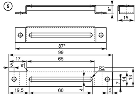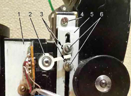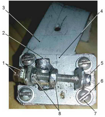 В качестве лазерного указателя использован доработанный лазерный модуль, который применяется в детских игрушках. Необходимо сфокусировать коллиматор лазера на короткое расстояние и ограничить ток питания, который должен быть таким, при котором лазер только-только начинает светить. Это позволяет получить более тонкий луч (мне удалось добиться его диаметра 0,2 мм) и снижает излучение лазера до безопасного уровня. Узел крепления лазера в сборе показан на рис. 5, а чертежи его деталей - на рис. 6. Основание 3 и держатель лазера 4 изготовлены из листовой стали толщиной примерно 1 мм (я использовал стенки корпуса старого CD-ROMа). Просверлив в заготовках необходимые отверстия, отгибают у держателя 4 под прямым углом прямоугольные лепестки для крепления винта с лазерным модулем. Модуль разбирают, залуживают место пайки его латунного корпуса и две гайки М3. В отверстия отогнутых лепестков держателя 4 вставляют винт 5 (М3х28) и навинчивают на него обе гайки 8 так, чтобы они оказались между проушинами держателя (см. рис. 5). Корпус лазера 2 вставляют под винт 5 (между гайками 8) и припаивают к нему гайки так, чтобы он вплотную прилегал к держателю (это необходимо для безлюфтового перемещения лазера при вращении винта в процессе регулировки).