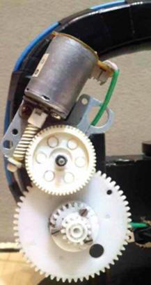 Далее на выступающий конец винта 5 навинчивают еще две гайки 1 (одна из них будет контргайкой) и затягивают их с таким расчетом, чтобы проушины держателя 4 не давали винту 5 смещаться вдоль оси. Теперь при вращении винта по часовой стрелке и в обратном направлении лазерный модуль будет перемещаться от одной проушины до другой. Для крепления держателя с лазером на основании 3 к последнему с обратной стороны припаивают четыре гайки (их хорошо видно на рис. 2). Затем в соответствующие отверстия держателя со стороны лазера вставляют четыре винта 7 (М3х15) с подложенными под головки шайбами 6 и надевают на них цилиндрические пружины сжатия, после чего ввинчивают их в припаянные к основанию гайки. Теперь с помощью винтов можно регулировать положение лазера в разных направлениях. Собранную конструкцию примеряют к тубусодержателю (верхней части микроскопа), загибают вокруг него хвостовик основания держателя лазера и, перенеся острой чертилкой контуры отверстий в основании на тубусодержатель, сверлят в нем два отверстия диаметром 2,5 и глубиной 10 мм и нарезают в них резьбу М3. В завершение закрепляют основание держателя лазера на микроскопе винтами М3. Для подачи сверла использован электродвигатель с червячным редуктором от видеомагнитофона (разбирал аппарат давно, поэтому указать его название не могу). Этот механизм (рис. 7) закреплен на тубусодержателе микроскопа с помощью трех металлических стоек с внутренней и наружной резьбой М4 и такого же числа винтов М4. Шестерня закреплена на ручке микроскопа тремя винтами М2,5 с гайками, отверстия в обеих деталях - сквозные. Необходима аккуратность при сборке - несоосность шестерни и ручки должна быть минимальной.