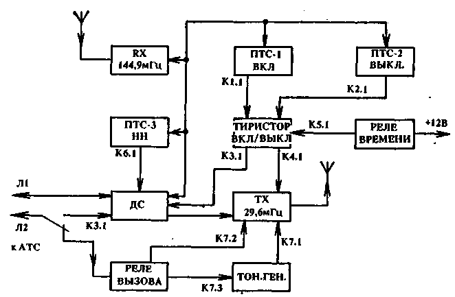 Стационарная часть состоит из дуплексной радиостанции, трех приемников тональных сигналов (ПТС1, ПТС2, ПТC3), дифференциальной системы, тиристорного устройства включения-выключения дифси-стемы и передатчика, реле вызова, тонального генератора вызова и реле времени.