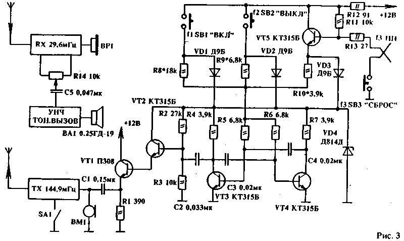 Принципиальная схема мобильной части приведена на рис.3. На транзисторах VT3, VT4 собран тональный генератор, который включается кнопками SB1, SB2, SB3 или номеронабирателем через диоды VD1 - VD3, а частота генератора подбирается резисторами R8, R9, R10 под частоту приемников тональных сигналов ПТС1 - ПТC3. На транзисторах VT1, VT2 собран усилитель, с выхода которого напряжение тональных сигналов поступает через конденсатор С1 на микрофонный вход передатчика. На транзисторе VT5 собран электронный ключ для номеронабирателя и кнопки сброса SB3. Выключатель SA1 предназначен для включения передатчика.
