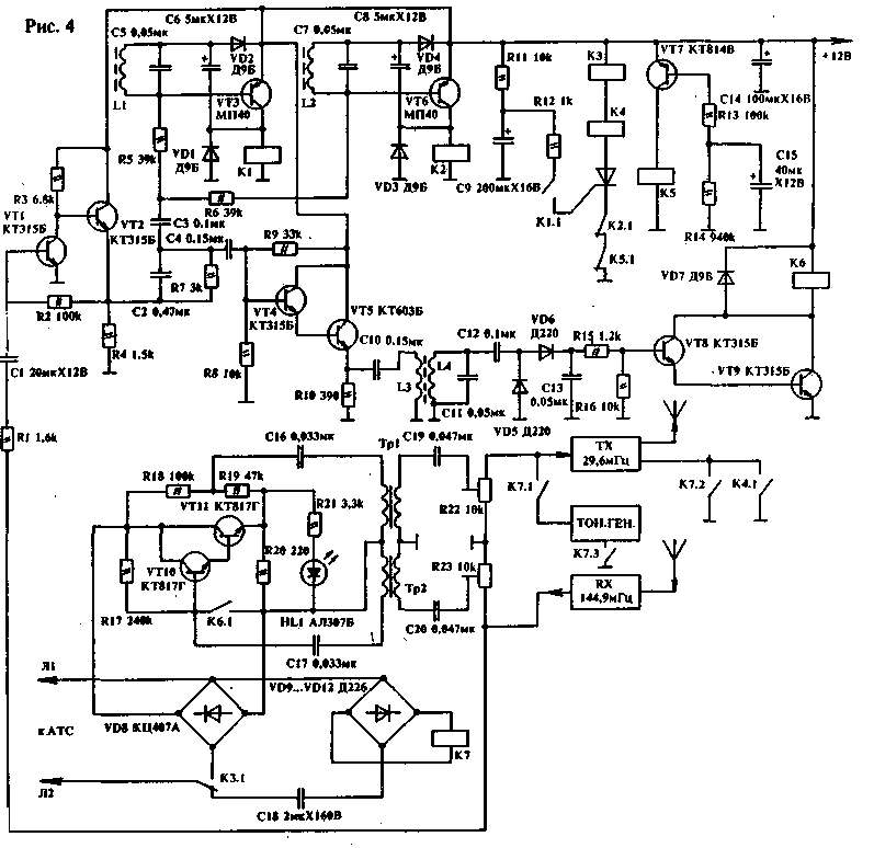 Принципиальная схема стационарной части изображена на рис.4. На транзисторах VT1, VT2 собран общий усилитель тональных сигналов, поступающих с НЧ выхода приемника через резистор R1 и конденсатор С1 на его вход. Приемник тонального сигнала с частотой 1610 Гц (ПТС-1) на транзисторе VT3 и элементах L1, С5, К1 предназначен для включения дифсистемы и передатчика контактами К1.1, КЗ. Г, К4.1.