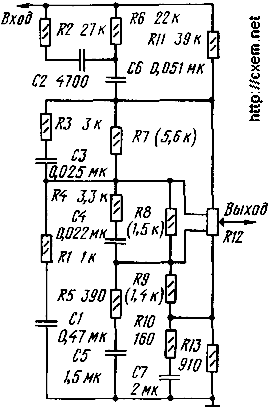 ЭНЦИКЛОПЕДИЯ РАДИОЭЛЕКТРОНИКИ И ЭЛЕКТРОТЕХНИКИ Тонкомпенсированный регулятор громкости-2. Энциклопедия радиоэлектроники и электротехники Энциклопедия радиоэлектроники и электротехники / Регуляторы тембра, громкости В процессе разработки автором регулятора громкости для высококачественного стереофонического усилителя и знакомства с рядом публикаций на эту тему выяснилось, что некоторые положения статей, помещенных в журнале "Радио" и другой радиолюбительской литературе, достаточно спорны. Так, например, широко распространено мнение, что высококачественный регулятор громкости невозможно построить на переменных резисторах, поскольку их характеристики имеют большой разброс от экземпляра к экземпляру и сопротивления изменяются в процессе эксплуатации. Однако от этих недостатков можно избавиться, ослабив влияние неиндентичности и нестабильности параметров переменных резисторов на характеристики регулятора громкости шунтированием каждого участка резистора между соседними отводами постоянным резистором с существенно меньшим сопротивлением. Существует также точка зрения, что диапазон регулирования громкости высококачественного усилителя должен составлять 60...70 фон. Но в таком случае уровень громкости в минимальном положении регулятора составляет около 30 фон и большая часть динамического диапазона высококачественной музыкальной программы оказывается в неслышимой области (имеются в виду источники сигнала с динамическим диапазоном не менее 80 дБ, например, проигрыватель компакт-дисков или Hi-Fi магнитофон). Исходя из своего опыта, автор считает оптимальным диапазон регулирования громкости 50 фон, т.е. при максимальном уровне громкости 95... 100 фон минимальный должен составлять 45...50 фон, что удобно для ночного прослушивания при отсутствии бытовых шумов и не мешает спящим в соседней комнате. Далее, все опубликованные схемы регуляторов имеют горизонтальную часть АЧХ только в положении максимальной громкости. Но для правильного звуковоспроизведения необходимо, чтобы АЧХ была горизонтальна при том уровне громкости, при котором звукорежиссер производит музыкальную балансировку программы. А такой уровень совсем не обязательно должен быть максимальным. И наконец, утверждение, содержащееся в статье П.Зуева "Регулятор громкости с распределенной частотной коррекцией" (см. "Радио", 1986, № 8, с.49-51), что требуемый подъем АЧХ в области низших звуковых частот прямо пропорционален ослаблению сигнала, вносимому регулятором громкости на средних частотах, по мнению автора, является неверным. Регулятор, собранный в соответствии с рекомендациями этой статьи, дает ощущение избытка низших частот почти при всех уровнях громкости, кроме самых больших. Если проанализировать вид кривых равной громкости, можно заметить, что при больших уровнях подъем АЧХ на низших частотах при уменьшении коэффициента передачи регулятора должен быть меньшим, чем указано в названной статье. С учетом изложенных выше соображений, автором был рассчитан, построен и испытан регулятор громкости для высококачественного стереофонического усилителя. Принципиальная схема одного из каналов регулятора показана на рис. 1, а его АЧХ- на рис. 2. Расчет и подгонка номиналов элементов проводились на персональном компьютере. Регулятор громкости рассчитывался для 