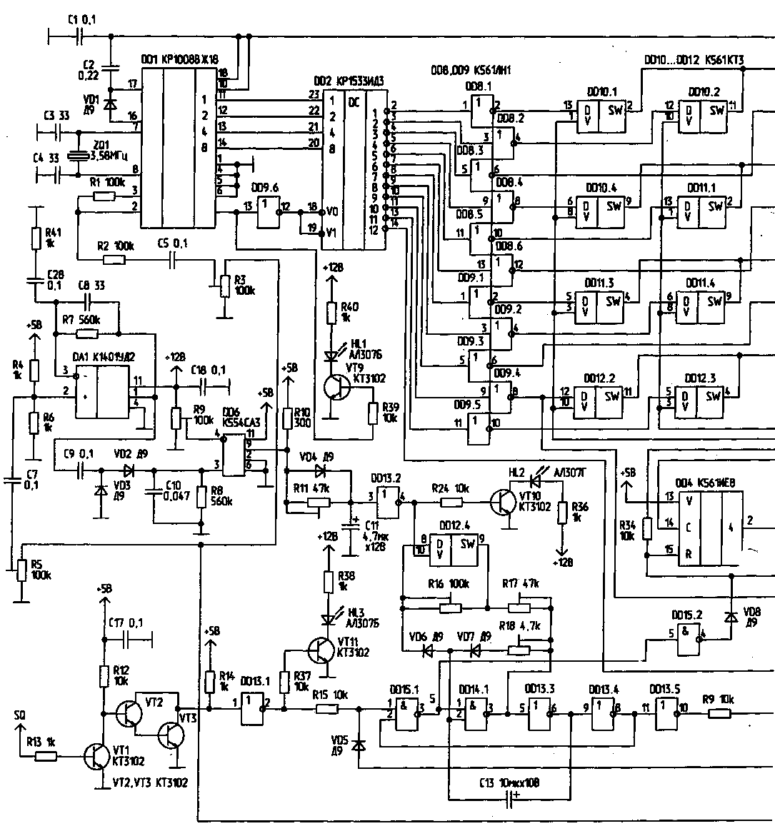 - приемника и преобразователя DTMF сигналов в десятичный код и импульсы набора номера, выполненных на DD1...DD3, DD8...DD12;