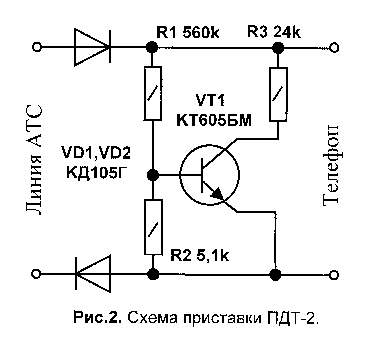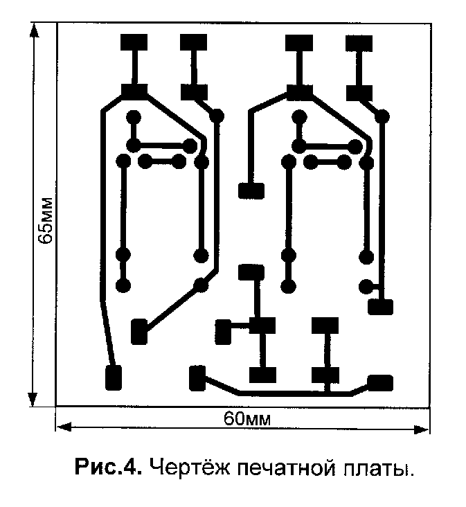 У таких телефонных линий множество недостатков, и один из них - это пониженный уровень вызывного сигнала. Из-за чего вызывные устройства некоторых ТА (особенно зарубежных), в которых схема рассчитана на номинальное напряжение вызывного сигнала, при спаренном включении ТА могут не работать. Не лишены недостатков так же и схемы разрядки конденсатора в цепи звонка. Что на мой взгляд является основной причиной неработоспособности большинства электронных вызывных устройств телефонных аппаратов, т.к., они достаточно высокоомны по сравнению с электро-механическими. На страницах радиолюбительской литературы, в том числе и в Интернете, неоднократно "всплывала" эта проблема. Везде предлагалось установить дополнительные устройства, которые не просто усложняют подключение к ним ТА, их размещение, но и приводят к ослаблению сигнала, а иногда и совсем неработоспособны в реальных условиях. А цены на некоторые из них доходят до 10 долларов!! Это - извините, дурдом! В нашем городе работает несколько различных АТС и столкнувшись с этой проблемой, оказалось, что одни и те же приставки на разных АТС ведут себя по разному. Поэтому приставку следует настроить конкретно под вашу АТС. Именно по этому поводу и хотелось бы поделиться своими соображениями. И дать несколько полезных советов. Во-первых Если у вас установлена приставка ПДТ-1 (рис.1.), то её следует заменить, т.к., её настройка слишком трудоёмка (подбор транзистора). В этом случае рекомендую удалить все детали (кроме диодов) из снятой приставки и навесным монтажом спаять по любой из типовых схем, приведённых на рис.2 или рис.3. (рекомендую рис.3.) Во-вторых Сразу же хочется сделать одно замечание. Номинал резистора R3 по схеме на рис.3 следует увеличить до 24 кОм, как и по схеме на рис.2. Не следует уменьшать сопротивление этих резисторов ниже18 кОм, т.к., это может привести к сбоям на некоторых АТС. Хотя по типовой схеме его номинал 11 кОм. Мной было изготовлено устройство, содержащее на общей печатной плате две идентичных приставки по схеме ПДТ-3. Чертёж печатной платы приведён на рис.4, а монтажный - на рис.5. Для подключения к устройству проводов, на плате установлены металлические контактные скобы с болтиком по середине от старых ТА. Собранная плата помещена в пластмассовый корпус подходящих размеров. В устройстве были применены транзисторы КТ940А, резисторы МЛТ-0,5, и диоды КД105Г, под которые и рассчитана печатная плата. Новое устройство было установлено вместо двух приставок ПДТ-1. В схемах ПДТ-2, ПДТ-3 были опробованы транзисторы КТ940А. В приставке ПДТ-2 лучше работают КТ605БМ. Рекомендуемые резисторы МЛТ-0,5; 0,25. Настройка всех приставок идентична и заключается в следующем. Замерьте напряжение вашей телефонной линии. Измерения производите стрелочным вольтметром - цифровой тут не годится в виду его большой инерционности. Далее временно вместо резистора R2 подключите переменный, сопротивлением 20…30 кОм, установив его движок в положение минимального сопротивления. Теперь подайте на вход приставки постоянное напряжение величиной, большей на 3…5В, чем ранее измеренное на телефонной линии. Подключите вольтметр к выходу приставки и медленно увеличивая сопротивление переменного резистора следите за показаниями вольтметра. Необходимо найти такое положение движка переменного резистора, при котором показания вол
