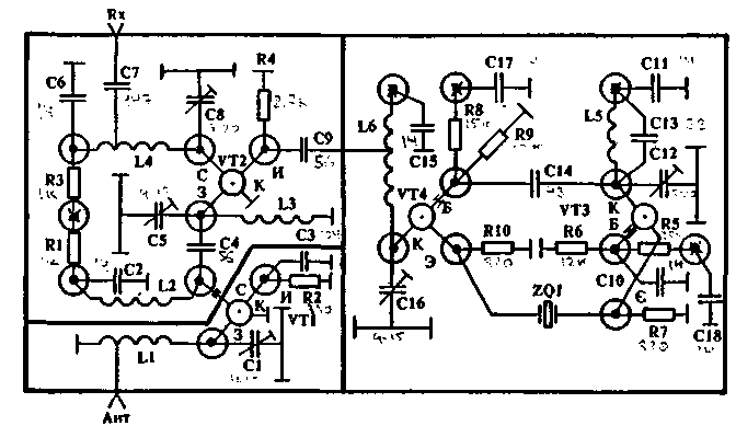 LI - 5 витков, отвод от 1,5 от холодного конца; L3 - 5 витков; L4 - 11 витков, отвод от 1,5; L5 - 15 витков (для he - 13 МГц); L6 - 9 витков, отвод от 4,5. На выводы баз VT3 и VT4 на вывод стока VT1 надеты ферритовые колечки. L2 - дроссель ДМ (0.1-100 мкГн).