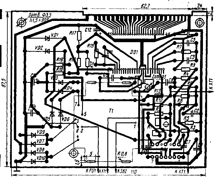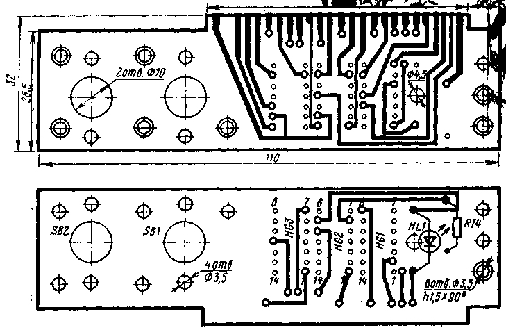 Стабилизатор тока питания моста выполнен на операционном усилителе DA1.2. Подстроечный резистор R11 позволяет в небольших пределах изменять значение выходного тока, что дает возможность изменять крутизну преобразования сопротивления термодатчика в напряжение и обеспечивает установку верхней границы измеряемой температуры. Нижнюю границу устанавливают подстроечным резистором R1. Напряжение с диагонали измерительного моста, пропорциональное температуре, усиливается дифференциальным усилителем, выполненным на операционном усилителе DA1.1, и с его выхода подается на вход АЦП. Конденсаторы С1, С2, С4 служат для фильтрации помех. АЦП реализован на БИС К572ПВ2А и работает по принципу двойного интегрирования с автокорректировкой "нуля" и автоматическим определением, полярности входного сигнала. Сигнал, несущий информацию о текущей температуре выбранного объекта, представлен на выходе АЦП в виде, удобном для отображения семиэлементными индикаторами. Он поступает на табло, состоящее из трех светодиодных индикаторов HG1 - HG3 и светодиода HL1. Светодиод загорается при отрицательной температуре измеряемого объекта. Для разделения целых и десятых долей градуса на индикаторе HG2 высвечивается запятая. Питается термометр от сети переменного тока напряжением 220 В через трансформатор Т1. Для стабилизации питающего двуполярного напряжения предусмотрены параметрические стабилизаторы VD1R18 и VD2R19. Образцовое напряжение для АЦП и стабилизатора тока снято с делителя напряжения на резисторах R16, R17. Оно дополнительно фильтровано конденсатором С12. Все элементы цифрового термометра размещены на двух печатных платах (см. рис.3 и рис.4 ), соединенных между собой уголками. В приборе использованы постоянные резисторы R2 - R5 - С2-29В-0,125: R18, R19 - МЛТ-0,5; подстроечные - СПЗ-38, остальные - МЛТ-0,125. Конденсаторы С1 - С5, С9 - К73-17-С7, С10, С11 - КТ.1; С6, С8 - К10-7; С12-С 14 - К50-6. Для обеспечения взаимозаменяемости термодатчиков при сохранении заданной точности использованы серийно выпускаемые термопреобразователи сопротивления ТСМ-6114 ГОСТ 6651-72 с номинальной статической характеристикой гр.23. При отсутствии стандартных датчиков можно изготовить их самостоятельно. Для этого необходимо отмерить 619 см провода ПЭТВ диаметром 0,05 мм. намотать его бифилярно на изоляционную оправку, к одному концу провода датчика припаять один гибкий вывод, ко второму - два таких же вывода. Можно припаять датчик прямо к проводникам подводящего кабеля. На каждый датчик потребуется три проводника в кабеле. Такое подключение позволяет скомпенсировать температурную погрешность, вносимую проводниками кабеля. Далее изготовляют корпус, способный работать в той среде, где будет установлен датчик, закрепляют в нем оправку с обмоткой и заливают эпоксидной смолой. Сопротивление датчика при температуре 20 °С должно быть 57, 52 Ом. Трансформатор питания для уменьшения габаритов выполнен из четырех магнитопроводовПЛ6,5Х12,5х16 (сечение около 3 см.кв). Обмотка I содержит 3000 витков провода ПЭВ-2 0,08, II - 2Х130 витков провода ПЭВ-2 0,18, 111 - 70 витков провода ПЭВ-2 0,4. В трансформаторе питания возможно применение иного магнитопровода, однако высоту корпуса термометра при этом придется увеличить. Микросхему К157УД2 можно заменить на К140УД20 с соответствующими цепями коррекции: К572ПВ2А - на КР572ПВ2А, но придется изменить рисунок проводников пе