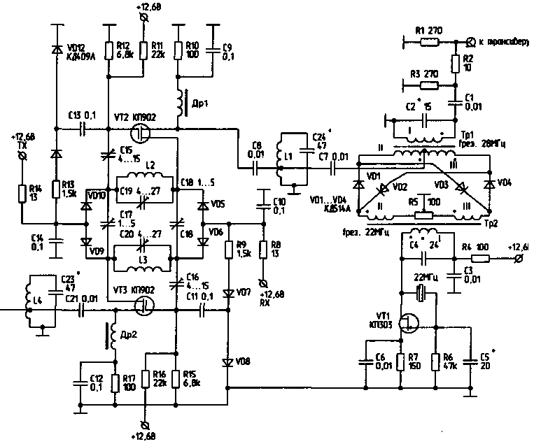 ЭНЦИКЛОПЕДИЯ РАДИОЭЛЕКТРОНИКИ И ЭЛЕКТРОТЕХНИКИ Трансвертер на 50...51 МГц. Энциклопедия радиоэлектроники и электротехники Энциклопедия радиоэлектроники и электротехники / Гражданская радиосвязь Так как современные трансиверы имеют чувствительность в диапазоне 28...30 МГц не хуже 0,25 мкВ, нет необходимости делать усиление приемной части приставки более 10 дБ. Совместно с трансивером общая чувствительность в диапазоне 50...51 МГц будет не хуже 0,1 мкВ, с достаточным динамическим диапазоном. Трансвертер имеет следующие параметры: - усиление в режиме приема - 10 дБ; Принципиальная схема трансвертера показана на рис.1. В основу положена оригинальная схема высокодинамичного реверсивного усилителя, успешно используемая в различных приемо-передающих конструкциях. Реверсивный усилитель в данной схеме имеет коэффициент усиления 20 дБ в обе стороны. Затухание сигнала в пассивном смесителе и аттенюаторе составляет 10 дБ, поэтому оставшиеся 10 дБ вполне достаточны для усиления по высокой частоте. В принципе, усилитель позволяет получить усиление до 40 дБ, для этого необходимо поднять напряжение питания до максимального паспортного значения (для КП902 - это 50 В), соответственно изменив напряжение смещения на затворах до получения тока стока в пределе 120 мА. Если используются малогабаритные контура с низкой добротностью, для получения необходимого усиления номиналы резисторов делителя (в схеме R12, R15) необходимо увеличить. От их величины и шунтирующего действия на колебательную систему зависит усиление схемы. Но, как и в любом деле, необходимо получить то, что необходимо, а лишнее на пользу не пойдет.