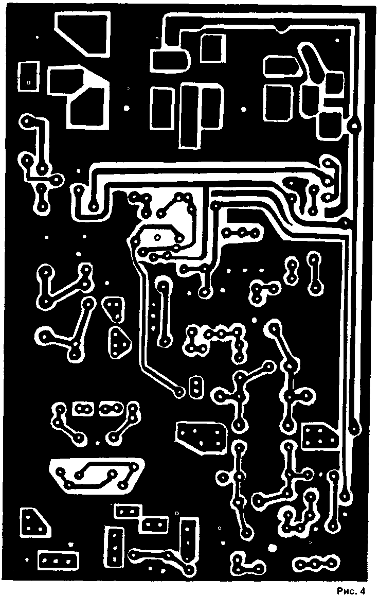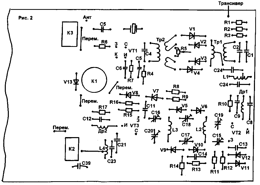 Работа схемы В режиме "Прием" сигнал с антенного гнезда через контакты реле К3, К2 поступает на одиночный контур L4, С23, который осуществляет предварительную селекцию в диапазоне 50 МГц. С контура сигнал поступает на реверсивный усилитель, в котором используется двухконтурный ФСС. С выхода усилителя сигнал поступает на контур-диплексор - L1, С24. В режиме "Прием" он повышает общую избирательность приставки и согласовывает выходное сопротивление усилителя с входным сопротивлением смесителя. Затем сигнал поступает на смеситель VD1...VD4, который выполнен по схеме двойного балансного смесителя. Выходной контур Тр1 настроен на середину диапазона 28 МГц. Затем сигнал поступает в трансивер. Кварцевый генератор на 22 МГц (VT1) собран по хорошо зарекомендовавшей схеме Пирса. Этот генератор обеспечивает малое содержание гармоник и достаточную амплитуду выходного сигнала. Колебательный контур генератора состоит из С4 и первичной обмотки трансформатора смесителя Тр2. В режиме "Передача" сигнал с трансивера, с амплитудой не более 0,5 В, поступает на вход трансвертера. Через аттенюатор R1, R2, R3 сигнал подается на смеситель. В результате сложения частоты 28...29 МГц с частотой кварцевого генератора 22 МГц, получаем сигнал в диапазоне 50...51 МГц. С выхода смесителя сигнал поступает на контур L1, С24, согласующий смеситель с реверсивным усилителем и осуществляющий предварительную селекцию сигнала. Затем сигнал усиливается реверсивным усилителем на VT2, VT3, и с контура L4, С23 сигнал через контакты реле К2.1 подается на вход усилителя мощности VT4...VT6. С выхода усилителя мощности сигнал через контакты реле КЗ.1 поступает в антенну. Усилитель мощности работает устойчиво. Намоточные данные: Тр1 и Тр2 оба намотаны на сердечнике СБ-12. Обмотки: I - 9 витков, II - 4 витка, III - 4 витка, провод - ПЭЛШО 0,29. Контурные катушки L1...L7 - бескаркасные. L1, L4 намотаны на оправке диаметром 6 мм проводом ПЭЛ 0,8 (9 витков), отвод от 3 витка; L2, L3 - на оправке диаметром 10мм проводом ПЭЛ 0,8 - 7 витков; L5 - на оправке диаметром 6,4 мм проводом ПЭЛ 0,33 - 1 виток; L6 - на оправке диаметром 6,4 мм проводом ПЭЛ 0,8 - 1 виток; L7 - на оправке диаметром 5 мм проводом ПЭЛ 0,8 - 5 витков. Др1, Др2 - типа ДМ с индуктивностью 30 мкГн; Др3 - типа ДПМ с индуктивностью 3 мкГн; Др4, Др7 намотаны на ферритовом кольце К10х6х4 600...1000 НН, 4 витка ПЭЛ 0,29; Др5, Др 8 - на резисторе МЛТ 0,5 на 180 Ом, 12 витков ПЭЛ 0,29; Др6 - Дм0,4, 20 мкГн; Др9-Дм3, 12 мкГн. При отсутствии указанных дросселей можно использовать любые сердечники стандартных дросселей, предварительно смотав обмотку и намотав новую, с требуемой индуктивностью. Настройка Вначале подбором емкости С4 и вращением сердечника Тр2 настраивается на имеющую частоту 22 МГц выходной контур кварцевого генератора. Добившись максимальной амплитуды на обмотке II или III трансформатора Т2, подбором емкости С5 устанавливают ВЧ напряжение 0,5 В. Подстроечным резистором R5 добиваются максимального подавления частоты 22 МГц на конденсаторе С7. Выключив питание схемы генератора путем отпаивания одного из выводов резистора R4, подбором емкости С2 и вращением сердечника Тр1 настраивают обмотку I Тр1 на частоту 28,5 МГц. Затем производят настройку реверсивного усилителя. Для этого необходим любой ИЧХ. Отпаивают конденсаторы С21 и С8 от контуров L4, С23 и L1, С24 соответственно, вместо них подпаивают резисторы по 100 Ом, подключают ИЧХ и соответственно подают треб