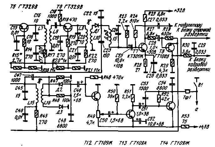 Сигнал с антенны через конденсатор С1 поступает на базу транзистора T1, который является высокочастотным усилителем. Транзистор включен но схеме с общей базой. Гетеродин собран на транзисторе T3, в коллекторную цепь которого включен колебательный контур L12C31. С катушки связи L11 сигнал гетеродина подается на смеситель (транзистор Т2). Сюда же поступает и усиленный телевизионный сигнал (с катушки L2). Преобразованный сигнал усиливается транзисторами Т4-Т6, которые входят в состав усилителя промежуточной частоты изображения (УПЧИ). Транзисторы Т4-Т6 включены но схеме с общей базой. Связь между каскадами трансформаторная. С выхода УПЧИ сигнал поступает на видеодетектор, выполненный на диоде Д1, а с него - на видеоусилитель (транзистор Т7) и на усилитель промежуточной частоты звука (УПЧЗ) на транзисторах Т9-T11, включенных по схеме с общей базой. Усиленный видеосигнал поступает на модулятор электроннолучевой трубки. На выходе УПЧЗ включен частотный детектор на диодах Д2 и Д3. На транзисторах Т12-Т14 собран усилитель низкой частоты. Его нагрузкой является миниатюрный телефон Тф1. На транзисторе Т8 выполнен амплитудный селектор синхроимпульсов. Разделение кадровых и строчных синхроимпульсов осуществляют интегрирующей цепочкой R30C29. Выделенные кадровые и строчные синхроимпульсы поступают соответственно в блок кадровой и строчной развертки. Телевизор "Василек" является модернизацией миниатюрного телевизора, разработанного участником XXIII Всесоюзной радио-выставки инженером Ю. Реутовым. Ряд узлов (блоки строчной и кадровой развертки, блок питания) "Василька" такие же, как и в телевизоре Ю. Реутова. Принципиальная схема этих узлов приведена на рис.2.