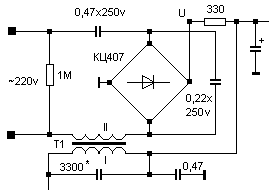 Для передачи используется частотная модуляция и несущая частота, равная 94 кГц. Устройство питается от сети. Излишек гасится конденсатором и пониженное напряжение выпрямляется диодным мостом. Далее оно фильтруется и ограничивается стабилитроном КС520 и используется для питания выходного каскада на VT1. Напряжение , снимаемое со стабилитрона КС210 используется для питания остальной части устройства. НЧ сигнал с микрофона усиливается каскадом на VT2 и подается на управляемый напряжением генератор прямоугольных импульсов на DD1(ЧМ модулятор). Начальную частоту генератора устанавливают, при отсутствии сигнала с микрофона, равной 94 кГц с помощью подстроечного резистора.