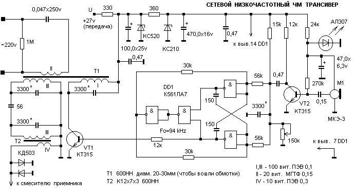 Эта схема изначально была задумана для связи по радиосети. Именно поэтому несущая равна 94 кГц и расположена между частотами второй (78кГц) и третьей (120 кГц) программы. Правда питание делалось отдельно, а выходной каскад передатчика нагружался на домотанную дополнительно обмотку стандартного трансформатора от абонентского радиоприемника. Число витков ну не помню сколько !. Приемник подключался к имеющейся вторичной обмотке. Дальше желание изобретать и улучшать пропало.