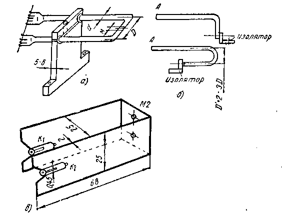 Очень удачными являются плоские или ленточные ВЧ линии. На рис. 1,в даны размеры четвертьволновой анод ной линии для диапазона 430 МГц для лампы ГУ-32, работающей утроителем частоты (144-432 МГц). В конструкции изображенной на рис.1,е, предполагается, что лампа ГУ-32 расположена перпендикулярно шасси. Если ее расположить горизонтально, то это позволит избежать изгиба линии в месте ее подключения к анодам и она будет являться продолжением плоскостей электродов анода. Чтобы уменьшить неоднородность этого перехода, которая эквивалентна внесению добавочной емкости и влечет укорочение контура, в полосках сделаны треугольные выемки куда впаиваются пружинящие контакты К1 и K2. Это позволяет вплотную придвинуть линию к баллону лампы по всей высоте полоски и уменьшить разрыв между ней и анодами лампы ГУ-32.