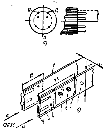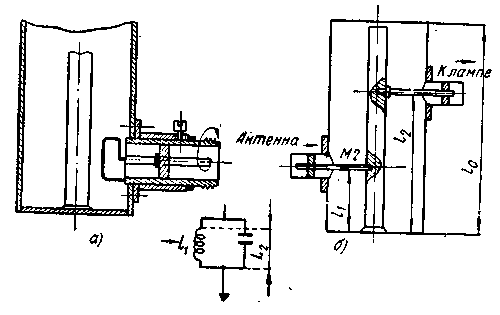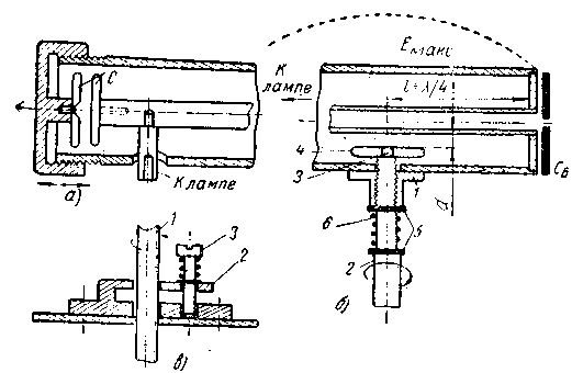 Степень связи можно изменить скачком, меняя размеры петли и степень связи поворотом плоскости петли на 90°. Фиксировать нужную степень связи можно стопорным винтом (рис.8,а). На рис.8,б показано автотрансформаторное включение цепи антенны при помощи общего отрезка коаксиальной линии l1 и цепи сетки с использованием длинной линии l2. Это помогает подобрать наивыгоднейшие условия работы (напри^ер, во входной цепи приемника). Правда, такой подбор у коаксиальной конструкции затруднителен и делается у опытного образца через продольную щель в наружном цилиндре. Положение отвода для определенного коэффициента трансформации сопротивления К зависит от общей длины lо самого резонатора. Если длина lо равна чистой четверти волны (идеальный случай), то К=10 получается, когда отвод размещен на расстоянии l2=0,215Л/4. Если общая длина lo Равна 0,5Л/4 (сильно укороченная линия), то при отводе l2=0,15Л/4 К равен 10 и т. д. Связь лампы с высокочастотными контурами В предыдущих разделах рассматривались условия работы ВЧ контуров, не связанных с лампой, или когда эта связь была чисто схематическая. В действительности на УКВ взаимная связь между этими звеньями очень сильная: лампа вносит в контур не только неоднородность, емкость, но и значительные потери. С другой стороны^ наибольший к. п. д, лампы зависит и от величины резонансного сопротивления контура, и от фазы напряжения, которое создают на электродах внешние, контуры. Чем выше рабочая частота, тем эти связи критичнее. Выше уже упоминалось о влиянии на внешний контур неоднородности, каковой является подключенная лампа. Важным звеном конструкции УКВ аппаратуры является переход, или способ подключения лампы к остальной схеме. Необходимо, чтобы этот переход не вносил больших реактивных сопротивлений и потерь во внешнюю цепь. У специальных УКВ ламп, например "маячковых", этот переход уже задан концентрической конструкцией самих выводов применительно к коаксиальным контурам. Но в диапазонах 144 и 430 МГц часто приходится использовать лампы обычной пальчиковой серии со штырьковыми выводами. Применение ламповой панельки удлиняет эти выводы и вносит значительную неоднородность, особенно заметную на 430 МГц и выше. На этих частотах лучше обходиться без панелек, соединяя лампу непосредственно с контуром каким-либо зажимом. Во многих УКВ узлах встречаются разделительный конденсатор и сопротивление утечки сетки. От выполнения их, а не от величины емкости часто зависит работа подобных схем. Если на месте разделительного конденсатора в цепь сетки взять керамический конденсатор (типа КДК или КТК и подключить его к сетке лампы через панельку, то в диапазоне 430-440 МГц внешняя индуктивность будет иметь дли ну 50-60 мм. Так как Л/4 равна примерно 17,5 см, то за счет емкость лампы и возникшей неоднородности действующая длина линии составляет лишь одну треть возможной длины, а это ведет к резкому понижению добротности контура и увеличению обратной связи и рабочего напряжения. Конструкция разделительного конденсатора Сс для лампы 12C3С (LD1) показана на рис.9. Лампа имеет по два жестких вывода как сетки, так и анода (рис.9,а) и поэтому контур между ними удобно сделать в виде плоской линии из полоски меди шириной 10-12 мм и толщиной 0,8-1,0 мм (деталь 1 на рис.9,б).