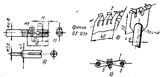 На рис.2 показаны конструкции зажимов контура для соединения с лампой. На рис.2,в дан пружинящий плоский зажим, впаянный в паз в проводах линии. Зажим делают из 10-миллиметровой полоски листовой бронзы (твердой латуни), на конце полоски лобзиком выпиливают четыре-пять прорезей на глубину 12 мм. Получившиеся полоски сначала отгибают в тисках в пазные стороны, а затем при помощи сверла или провода диаметром 1,5 мм отжимают, образуя плотные цилиндрики. Полоски эластичны и дают надежный контакт с выводом лампы ГУ-32. Контакты такого типа можно применять и для более тонких выводов, например у лампы 6НЗП. При горизонтальном расположении лампы ГУ-32 желательно, чтобы пружинящий контакт был продолжением самой линии в осевом направлении. Наиболее просто это получается, если в провод линии впаять гнезда от панельки для лампы ГУ-50 (рис.2,б). Надежный зажим можно сделать, используя проводник линии (рис.2,а). Для этого с торцовой части линии делают продольное отверстие диаметром 1,5 мм на глубину 11 мм и сквозное - для болта М2 на расстоянии 13 мм, затем провод разрезают на длину 16 мм и верхнюю часть отделяют. В нижней части делают резьбу М2, плоскости среза зачищают и обе части снова соединяют винтом М2. Если линию подсоединяют к штырькам анодов ГУ-32, то их можно жестко зажать, затянув винт М2. Закорачивающий мостик для настройки линии можно сделать из полоски бронзы толщиной 0,3-0,4 мм, шириной 10-12 мм, изогнутой по рис.2,г. Через центральное отверстие диаметром 3 мм и шайбу 3 полоски 1 и 2 стягивают винтом М3 и обхватывают провода линий. Конструкции коаксиальных контуров Материалом для конструкций являются медные или латунные трубки в пределах от 4 до 100 мм. Для таких контуров подойдут охотничьи гильзы калибра № 12-32. Их данные приведены в табл.1.