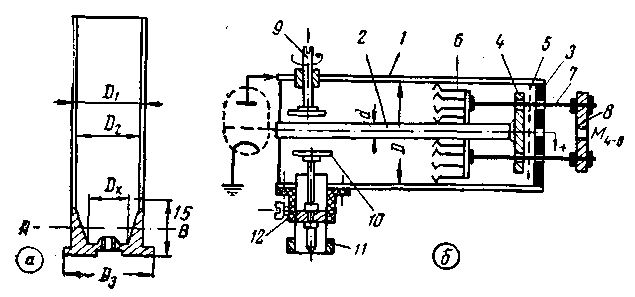 Поверхность материалов, применяемых для коаксиальных контуров, должна быть ровной, гладкой и защищенной от быстрого окисления (серебряные, хромированные). На рис.3,б показан упрощенный разрез коаксиального контура с необходимыми рабочими элементами. Рассмотрим в отдельности назначение этих деталей, их конструкцию и ее варианты, применительно к любительским возможностям изготовления. Диаметры D и d трубок 1 и 2 (рис.3,б) определяются или системой выводов электродов у ламп, или удобством конструкции наиболее ответственного элемента контура - поршня настройки G. Если диаметры трубок надо изменить незначительно (на 1-2 мм) и на коротком протяжении, то впаивают добавочное кольцо в нужное сечение трубок D и d