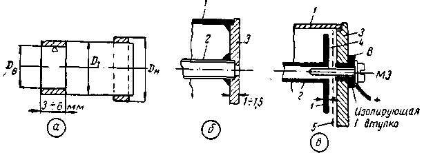 с последующей обработкой до нужного диаметра Dв и Dн (Рис.4,а). Добавочные вкладыши чаще всего устанавливаются в месте подсоединения лампы к линии. В этом случае впаянные кольца и часть несущей трубки разрезают по образующей в нескольких местах (6-12 полосок и более) Для получения пружинящего контакта. Длина трубок определяется системой генератора и рассматривается в главе о передатчиках на УКВ. Коаксиальные контуры обычно коротко замкнуты на одном конце, т. е. трубки 1 и 2 (рис.3,б) соединяются между собой при помощи дна 3 и диска 4 или без него (рис.4,б и в). При неразборном соединении трубок (рис.4,б) их впаивают в дно 3; для взаимной точной центровки дно делают с выемками. Если дно неточеное, то достаточную центровку можно обеспечить так: на листовом металле наносят острым циркулем диаметры D и d и вторые диаметры на 2 мм меньше D и на 2 мм больше d. Эти вспомогательные круги помогают при ручной обработке сохранить концентричность внешнего обвода дна и внутренне отверстия с диаметром d, так как при обработке поверхность есть возможность контроля ее кривизны по ближайшим вспомогательным кругам. На рис.4,в показан второй вариант соединения трубок 1 и 2 через разделительную емкость. Для этого на трубку 2 перпендикулярно впаивают диск 4 и на конце трубке делают резьбу. Внешнюю трубку 1 впаивают в дно 3, в центре которого пропускают втулку В из изолирующего материала. Трубки 1 и 2 соединяют вместе болтом М3, причем между гладкими, отполированными поверхностями дна 3 диска 4 прокладывают слюду 5 толщиной 0,1-0,15 мм: слюда должна доходить до диаметра D. Диаметр диска 4 делают на 2-3 мм меньше D. Если диаметр диска 4 будет 30 мм, то при слюде толщиной 0,1 мм емкость разделительного конденсатора будет около 375 пФ, а емкостное сопротивление перехода на частоте 430 МГц около 0,8 ом. Такие конденсаторы необходимы для разделения цепей ВЧ от цепей питания. При соединении деталей на УКВ и СВЧ очень серьезно надо подходить к пайке деталей. Плохая пайка может в два три раза ухудшить добротность контуров. Самым сложным элементом коаксиальных конструкций являются системы настройки в широком диапазоне. Обычно это осуществляется продольным перемещением "короткого замыкания", выполненного в виде разных поршней. Сущность такой системы видна на рис. 1-20,6, детали 6, 7, 8. Основное требование к любой системе перестройки - минимальные потери, вносимые ей в контур, и постоянство их со временем. Так как в радиолюбительских условиях можно обойтись без широкодиапазонной настройки, то в системе перестройки поршней излагаются лишь основные соображения и конструкции поршней, наиболее просто осуществимы; Контактный лепестковый поршень, у которого получается пружинящий механический контакт между поверхностями трубок коаксиального контура (рис.5,а);