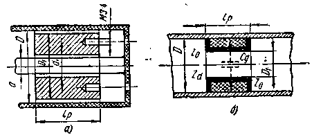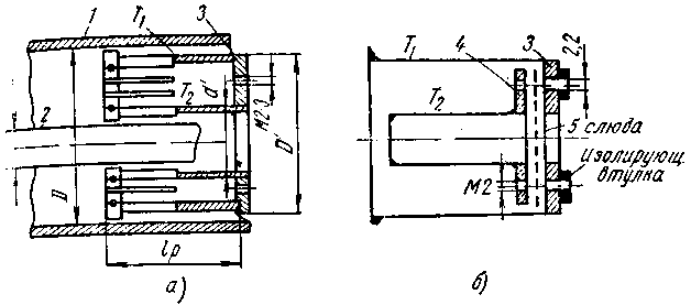 Все другие типы поршней - бесконтактные, z-образные дроссельные и другие - сложны и трудно повторимы в любительской практике. Контактный, лепестковый поршень (см. рис.5) проще всего собрать из кусков латунных трубок Т1, Т2 подходящих диаметров с толщиной стенки 1-5мм. В зависимости от упругости материала и возможности обработки длина поршня lр может быть от 10 до 25 мм. Наружный диаметр трубки Т1 по длине уменьшается на 0,4-0,5 мм с таким расчетом, чтобы на одном конце остался бортик шириной 2-3 мм. Такой же бортик оставляют и у трубки Т2, но только с внутренней стороны. Это позволяет сосредоточить давление на концах трубок T1, T2 и значительно улучшает надежность и постоянство контакта. При обработке на токарном станке по середине бортика можно сделать неглубокую (0,15-0,2 мм) канавку, на которую при сборке натягивают пружинящее кольцо из стальной проволоки диаметром 0,4-0,6 мм. У трубки T1 канавку делают с внутренней стороны, у T2 - с наружной (на рис.5 показано точками). По ободу трубок, со стороны бортика, лобзиком или тонкой шлицовкой протачивают продольные прорези, создающие контактные лепестки. Их число и разме-ры зависят от упругих свойств материала, диаметра и длины поршня. Обычно ширина лепестка бывает около 2-3 мм на Т2 и 3-5 мм на внешней трубке. Эту операцию необходимо делать очень осторожно, чтобы не создать остаточной деформации у будущих лепестков, не оставить заусениц и не поцарапать поверхность бортиков, которая должна всегда оставаться очень гладкой, скользящей. Трубки Т1 и Т2 при этой операции надевают на деревянные болванки нужных диаметров. Затем их соединяют с дном 3 и хорошо пропаивают. В дне на окружности диаметром (D'+d'')/2 делают два или три отверстия с резьбой М2 или М3 для крепления тяг 7 (см. рис.2,б), необходимых для передвижения поршня. Хорошим материалом для тяг могут быть двухмиллиметровые спицы. Кольцо 8, скрепляющее тяги снаружи системы, имеет центральное отверстие с резьбой М4 или М6, через которое пропускают винт М4 (М6), создающий при вращении поступательное движение поршня. Без такой кинематической системы привода настроиться на нужную частоту "от руки" невозможно. В качестве трубок Т1, Т2 для поршня иногда можно использовать основания охотничьих гильз. Наружный бортик на гильзе необходимо обточить до нужного диаметра. Бортик и нужный внутренний диаметр у трубки Т2 можно получить, срезав тыловую часть гильзы на определенной высоте (см. рис.3,а, линии среза АВ). Контактный поршень создает короткое замыкание в коаксиальном контуре и механически и электрически. Часто, однако, требуется, чтобы цепь по высокой частоте была замкнута, но в общей цепи не было бы замыкания для источника питания. В таких случаях поршень должен работать как емкость для токов ВЧ и, следовательно, наружные трубки Т1 и Т2 в нем должны быть изолированы друг от друга и одновременно иметь достаточную емкость. Такая конструкция поршня с разделительной емкостью схематически показана на рис.5,б. Поршень мало чем отличается от конструкции, изображенной на рис.4,в. Так как центральная часть в поршне должна быть свободна для прохождения внутреннего проводника d коаксиального контура, то дно 3 и дополнительный диск 4, впаянный на трубку поршня Т2, должны соединяться тремя болтами, расположенными по диаметру Т1+Т2 и быть изолированными друг от друга. Это достигается прокладкой и