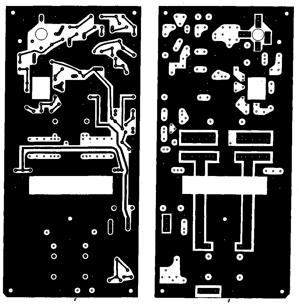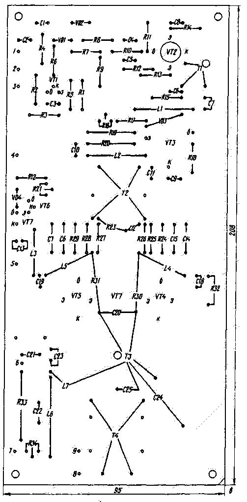 Коммутировать звенья фильтра при переходе с одного диапазона на другой можно как галетным переключателем, так и реле (например, РПА12, РПС2/7, РЭС47). Усилитель собран на печатной плате из двустороннего фольгированного стеклотекстолита (рис.3). Расположение деталей показано на рис.4. В устройстве применены постоянные резисторы МЛТ-0,25, МЛТ-0,5 (R30, R31). Резистор R33 изготавливают из подходящего отрезка нихромовой проволоки от спирали электроплитки. Подстроечные резисторы R16, R21, R34 - СПЗ-19А. Подойдут также СПЗ-27А, СПЗ-38А. Конденсаторы С13, С21, С24 - К50-6, К50-16, остальные - К10-7В или КМ. Диоды КД409А заменимы на КД407А или, в крайнем случае, на КД522Б. Транзистор VT1 - КТ315 с любым буквенным индексом, VT2 - КТ610А или КТ606А. В предоконечном каскаде можно использовать КТ922Б, в оконечном - КТ931А. КТ956А и другие с выходной мощностью не менее 70 Вт. Трансформатор Т1 выполнен на кольце (типоразмер К12Х6Х4,5) из феррита 1000НН. Обмотки содержат по 10 витков, их наматывают одновременно двумя свитыми между собой проводниками ПЭВ-2 0,31. Шаг скрутки - 10 мм. Такие же кольца используют в трансформаторах Т2 и Т4 (рис. 5).