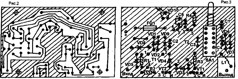 Ïðèíöèïèàëüíàÿ ñõåìà óñèëèòåëÿ ïîêàçàíà íà ðèñ.1. Íà ðèñ.2 è 3 ïðèâåäåíû ïå÷àòíàÿ ïëàòà è ðàñïîëîæåíèå äåòàëåé íà ïëàòå. Äëÿ èçãîòîâëåíèÿ òðàíñôîðìàòîðà Ò1 áûëè èñïîëüçîâàíû øåñòü êîëåö ñ ìàãíèòíîé ïðîíèöàåìîñòüþ 600 ÍÍ (äî 1000 ÍÍ - íåêðèòè÷íî) òèïîðàçìåðà 7 õ 4 õ 2, ïî òðè êîëüöà ñêëååíû êëååì ÁÔ2, à çàòåì ïîëó÷åííûå ôåððèòîâûå "òðóáêè" ñêëàäûâàþò áîê î áîê è òîæå çàëèâàþò êëååì. Òàêèì îáðàçîì, ïðîäåâàÿ â ýòè òðóáêè ïî òðè âèòêà ïåðâè÷íîé îáìîòêè è âòîðè÷íîé, ïîëó÷àåì òðàíñôîðìàòîð Ò1 (ðèñ.4).