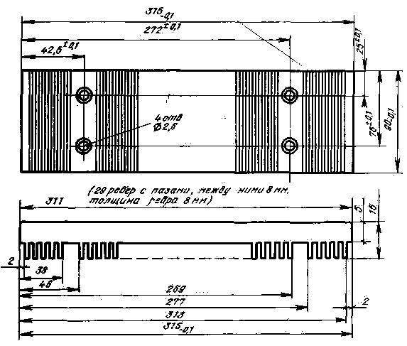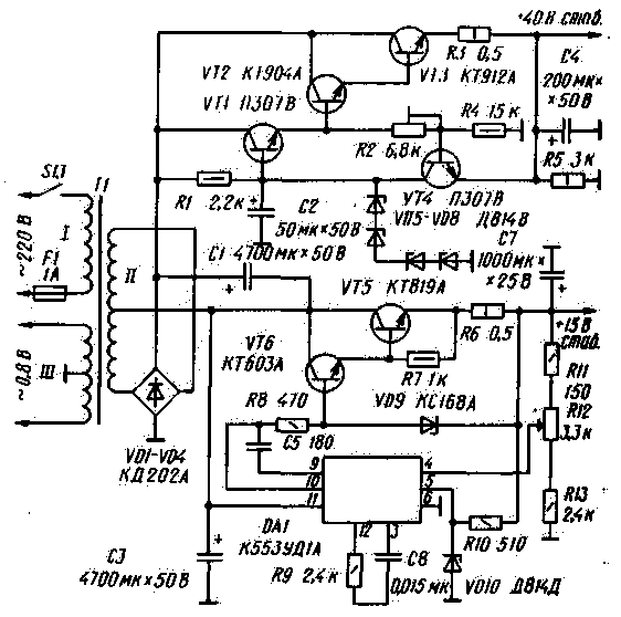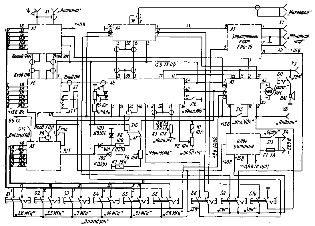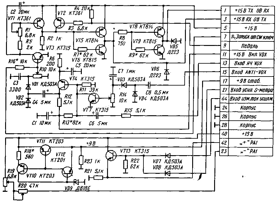 Формирователь напряжения SSB и CW сигнала - узел А4 показан на рис. 8. На транзисторе VTI собран опорный кварцевый генератор с частотой 9100 кГц. Транзистор VT2-буферный каскад, с которого сигнал опорного генератора поступает на балансный модулятор на варикапах VD1, VD2 и трансформаторе Т1. Модулятор имеет высокую линейность и позволяет подавить несущую частоту не менее чем на 50 дБ. Каскад на микросхеме DA1 [представляет собой микрофонный УНЧ, с выхода 'которого усиленное напряжение низкой частоты поступает на среднюю точку обмотки L3 балансного модулятора и через эмиттерный повторитель VT6 в систему голосового управления (VOX). Каскад на транзисторе VT5 - манипулируемый телеграфный гетеродин, стабилизированный кварцем ZQ2. Его частота на 800...900 Гц выше частоты опорного гетеродина, т. е. совпадает с полосой "прозрачности" кварцевого фильтра ZQ1. В зависимости от вида работы, телефон или телеграф, на эмиттерный повторитель VT4 подается через контакты реле К1 напряжение либо от балансного модулятора (SSB), либо от телеграфного гетеродина (CW). С выхода транзистора VT4 сигнал поступает для дальнейшего преобразования в узел А6 (основная плата). С помощью подстроечного резистора R21 устанавливается необходимое усиление микрофонного УНЧ, с помощью резисторов RI8, R15 производится балансировка несущей частоты опорного гетеродина. Индуктивность L1 служит для точной установки частоты опорного гетеродина на нижнем скате характеристики кварцевого фильтра ZQI. Работой трансивера в режиме "прием" или <передача" управляет коммутатор - узел А7 (рис. 9). Собственно коммутатор выполнен на мощных транзисторах VT5 - VT9. Транзисторы VT1. VT3, VT4 входят в систему VOX. VT7 - Anti-VOX. С помощью подстроечного резистора R1 устанавливается задержка срабатывания системы голосового управления, a RIO - порог срабатывания системы VOX. Резисторы R14 устанавливает порог срабатывания системы Anti-VOX. На транзисторах VT10 - VT12 выполнен стабилизатор напряжения плавного гетеродина +9 В. На транзисторе VT13 собран усилитель S-метра. В режиме приема на его вход через диод VD7 подается напряжение АРУ с основной платы, а через диод VD8 напряжение с узла А1, пропорциональное току стока мощного транзистора VT1. С помощью подстроечного резистора R19 устанавливается нуль S-метра, a R20 служит для калибровки. Управление коммутатором может происходить от педали, которая подключена к контакту 9 разъема XI как в режиме SSB, так и в CW. В режиме CW положительные импульсы, которые подаются на контакт 7 разъема XI от электронного автоматического телеграфного ключа, воздействуют на систему голосового управления, т. е. может осуществляться полудуплексная работа трансивера. Напряжения +15 В ТХ - О В RX снимаются с контактов 1,3 разъема X1 и поступают в узлы трансивера. Стабилизаторы +40 В и +15 В в блоке питания (рис. 10) выполнены по известным схемам и защищены по току. Схема соединений узлов трансивера приведена на рис. 11. Каркас изготовлен из дюралюминиевых листов толщиной 5 мм, соединенных с помощью винтов М2,5 в торец. Передняя и задняя панель имеют размеры 315Х130 мм и скреплены между собой двумя боковинами размером 270X130 мм. Боковины установлены на расстоянии 40 мм от кромок передней и задней панели, образуя подвалы, в которых размещены печатные платы: слева - плата узла А2, справа - узлов А7, А5 (электронный телеграфный ключ). Между боковинами на высоте 40 мм от нижней кромк