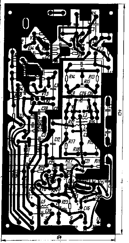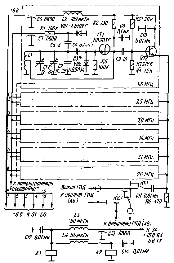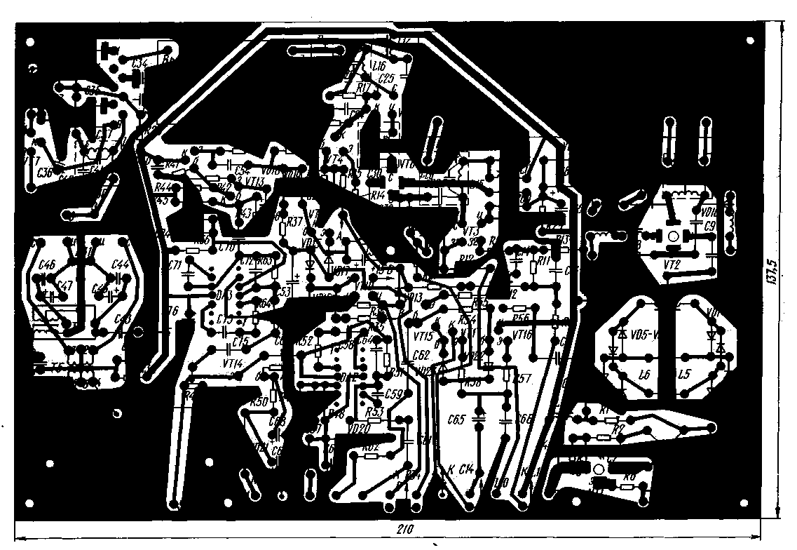 Контуры полосовых фильтров размещены в алюминиевых экранах размерами 20Х20 мм и высотой 25 мм. Трансформатор блока питания с габаритной мощностью около 70 Вт намотан на ленточном кольцевом магнитопроводе ОЛ50/80-40. Первичная обмотка намотана проводом ПЭВ-2 0,41 и содержит 1600 витков. Вторичная обмотка намотана проводом ПЭВ-2 1,5 и содержит 260 витков. Транзистор КП905 в узле А6 может быть заменен на КП903А. Настройка трансивера. Перед установкой элементов на платы необходимо проверить их исправность. Сначала каждая плата настраивается отдельно. Для этого используются отдельный источник питания и необходимые приборы. Настройку целесообразно проводить в такой последовательности : Узел А7. Коллектор транзистора VT1 соединяют с общим проводом и подбирают резистор R7 так, чтобы на коллекторе транзистора VT6 остаточное напряжение было не более +0,3 В. Соединения восстанавливают. Подбором резисторов R8. R9 устанавливают на коллекторе VT9 напряжение, близкое к нулю, но не более +0,3 В. Выводы 1, 3 на разъеме XI должны быть нагружены при настройке на резисторы сопротивлением около 30 Ом и мощностью рассеивания не менее 5 Вт. Узел A3. Налаживание диапазонных генераторов заключается в установке генерирующей частоты, указанной в табл. 2, с помощью конденсаторов С2, С3 и числа витков индуктивности L1 (отвод от катушки берется от 1/4-1/5 части витков). Конденсатор С4 подбирают минимальным, контролируя устойчивость генерации. Подбором С5 устанавливается необходимая расстройка частоты. В заключение проводится тщательная термокомпенсация контура с помощью конденсатора C3, составленного из групп с разным ТКЕ. Коробка ГПД при проведении термокомпенсации нагревается до 35...40 °С. Выходное напряжение на резисторе R6 должно составлять 0,15...0,2 Вэфф. Узел А4. Напряжение ВЧ на стоке транзистора VT3, подаваемое на модулятор, должно быть около 2 Вэфф. Напряжение НЧ на выходе микросхемы DA1 должно составлять 1...1,5 А, при подаче на микрофонный вход напряжения от звукового генератора частотой 1000 Гц и амплитудой 3...5 мВ. Модулятор, настраивается следующим образом: вначале, подключив к эмиттеру VT4 ВЧ-милливольтметр, с помощью С26 настраивают в резонанс контур L3C26VD1VD2 по максимуму сигнала. Затем закорачивают вход микрофонного усилителя и последовательной регулировкой резисторами R18, R15 балансируют модулятор на максимальное подавление несущей частоты по минимуму ВЧ напряжения на эмиттере VT4. Настройка манипулируемого генератора заключается в установке частоты кварцевого генератора ZQ2. Она должна быть выше частоты опорного генератора на 800...900 Гц (контролируется частотомером на контактах 5, 28 разъема XI). Величина выходного напряжения в этой точке должна быть около 0,3 В,.. как в телеграфном, так и в телефонном режиме (при произнесении громкого "а...а"). На выходе эмиттерного повторителя VT2 напряжение опорного генератора должно составлять 1,5...1,8 Вэфф. Узел А6. Настройку платы начинают с УНЧ приемника. Его чувствительность должна быть 5...10 мВ при нормальной громкости на выходе. Детектор VT8, VT9 балансируется при поданном напряжении опорного гетеродина и закороченном входе регулировкой резистора R31 по минимуму шумов на выходе УПЧ. Настройка УПЧ особенностей не имеет и заключается в настройке контуров на среднюю частоту кварцевого фильтра (при отключенной системе АРУ вывод 11 разъема X1 закоротить на "землю"). На вых